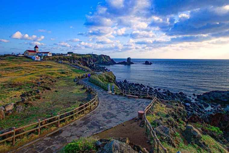 【涉地可支(涉地岬)】「涉地」是這一地區古代時的名稱,「可支」是濟州島方言,指如鼻端模樣尖尖突出的地形。特別是一到春天此地的油菜花與燦爛金黃的陽光、湛藍的海洋相互輝映。遼闊平緩的可支山坡上有名為俠子煙臺,由石頭搭成的烽燧臺,呈正方形,相對而言保存著原貌。烽燧臺東北方立著的山峰,又名紅岳,是由紅色火山灰所構成的山岳(寄生火山)。山頂有著白色燈塔,紅色的泥土、蔚藍的天空與大海,呈現充滿異國風情的美景。登上燈塔憑欄眺望,令人讚嘆不已的海岸絕景,就在眼前徐徐開展。