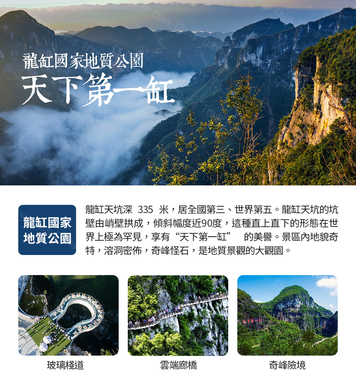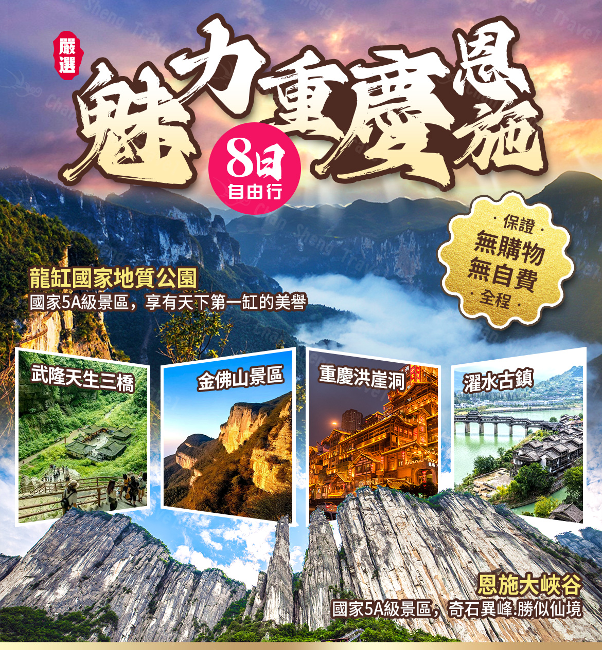 2025/12/31(三) | 桃園國際機場出發 【魅力重慶恩施8天】武隆天生三橋、恩施大峽谷、金佛山、龍缸絕壁玻璃棧道、浦花暗河、濯水古鎮風雨橋、無購物、無自費機位 20 候補0 已售0 可售19因政府政策調整目前中國大陸禁止出團;本行程售價僅提供參考 |