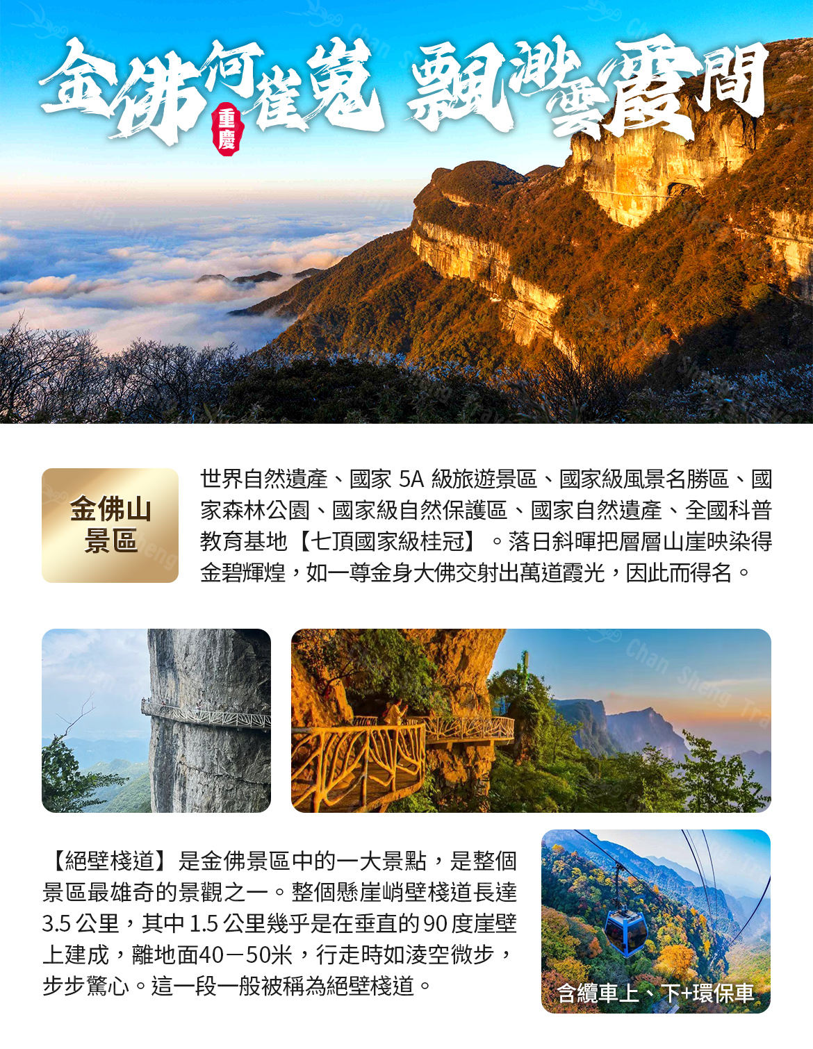 【金佛山景區】法是重慶市最早且唯一擁有世界自然遺產、國家 5A 級旅遊景區、國家級風景名勝區、國家森林公園、國家級自然保護區、國家自然遺產、全國科普教育基地“七頂國家級桂冠”,以其生物多樣性特點和獨特的喀斯特地貌特徵被列入世界自然遺產名單。同時正在積極申報“中國國家地質公園”與“國家地質地貌自然保護區” 等榮譽稱號。2014 年 6 月 23 日,金佛山風景區成功入選世界自然遺產名錄;景區位於神秘的北緯 30°附近,重慶市南川區境內,大婁山脈北部,面積 1300 平方千米,景區面積 441 平方千米,最高峰海撥 2238 米,“金佛何崔嵬,飄渺雲霞間”是對金佛山最美好的寫照,每當夏秋晚晴,落日斜暉把層層山崖映染得金碧輝煌,如一尊金身大佛交射出萬道霞光,異常壯觀而美麗,“金佛山”因此而得名;同時也是國家級自然遺產。被譽為“東方的阿爾卑斯山”