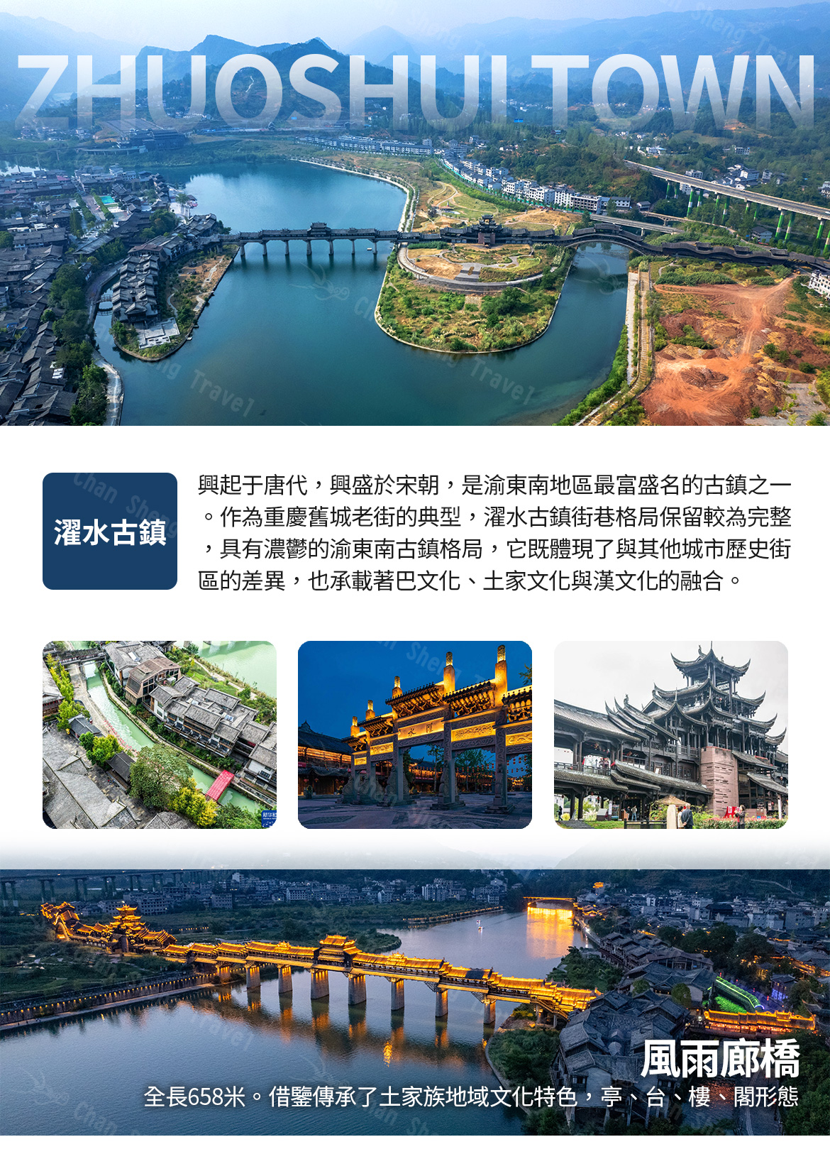 【濯水古鎮】位於黔江東南角,地處烏江主要支流“塘岩河”(阿蓬江)畔,主要居民為土家族和苗族。濯水古鎮距黔江主城 26 公里, 渝懷鐵路、渝湘高速公路、319 國道公路都從這裡交匯穿過,交通極為便利。濯水古鎮興起于唐代,興盛於宋朝,明清以後逐漸衰落,是渝東南地區最富盛名的古鎮之一。作為重慶舊城老街的典型,濯水古鎮街巷格局保留較為完整,具有濃鬱的渝東南古鎮格局,它既體現了與其他城市歷史街區的差異,也承載著巴文化、土家文化與漢文化的融合、傳承與創新,同時碼頭文化、商賈文化、場鎮文化相互交織。
