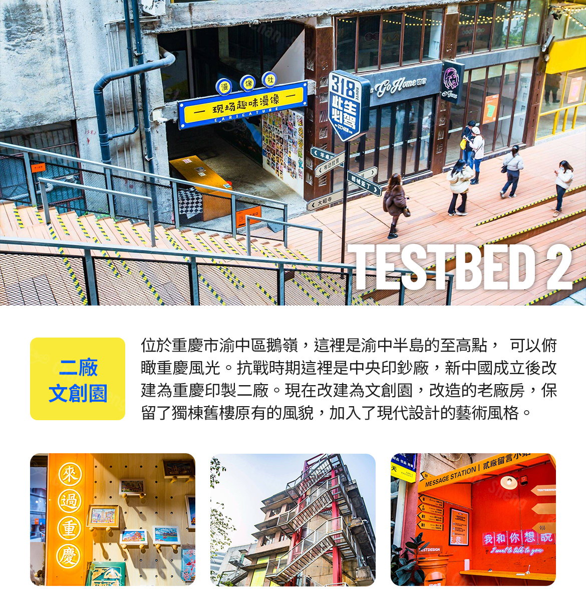 【二廠文創園】位於重慶市渝中區鵝嶺,這裡是渝中半島的至高點, 可以俯瞰重慶風光。抗戰時期這裡是中央印鈔廠,新中國成立後改建為重慶印製二廠。現在改建為文創園,改造的老廠房,保留了獨棟舊樓原有的風貌,加入了現代設計的藝術風格,老與新的糅合,獨具魅力,富有歷史滄桑的歲月感,吸引了眾多遊客前來拍照留影。