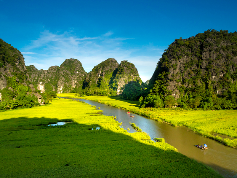 共有31河道潭水穿越48洞穴,目前只開放7個洞穴,山澗河川混合,遠眺河水平靜綠草如茵,河旁的矮山樹林常倒映在平靜無波的河面上,構成一幅極美的圖畫,是夢寐以求的渡假勝地。安排乘坐小舟遊覽,四人一艘,遊程約2小時,在寧靜的曲折小河蜿蜒其中而行,將帶領您穿越體驗七個石灰岩山洞:地靈洞、黑洞、明洞、三靈洞、山羊洞、辰谷洞、龜后洞,每穿越一個洞穴會帶給您不一樣感受,綠油油的叢林覆蓋山麓、石灰岩地形所形成的奇峰異石風光十分明媚,呈現出的是寧靜鄉村景色。沿河畔兩岸風景好比下龍灣有勝之而無不及,清澈見底,水波不興,偶見小屋,遺世獨立,小扁舟在山石間浮遊,遠眺一座座孤聳怪立的山巒,讓人覺得彷彿進入深邃 氛圍裡,緩緩的走進這塊世外桃源、清幽寧靜的幻夢奇境,讓人感覺沉浸在一股彷彿與世無爭與身體共譜出一首輕鬆悠哉的樂曲,這何嘗不是人生的奢侈享受!