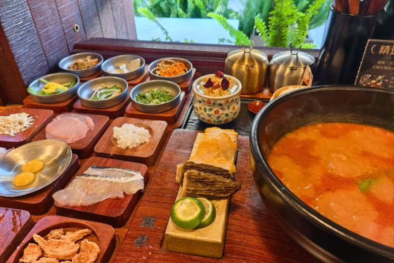 採用傳統六步吃法,湯底分酸湯/原湯兩種,搭配十餘種葷素配料,以雞湯為基底,加入濃湯寶提鮮,配菜需按生熟順序燙煮。