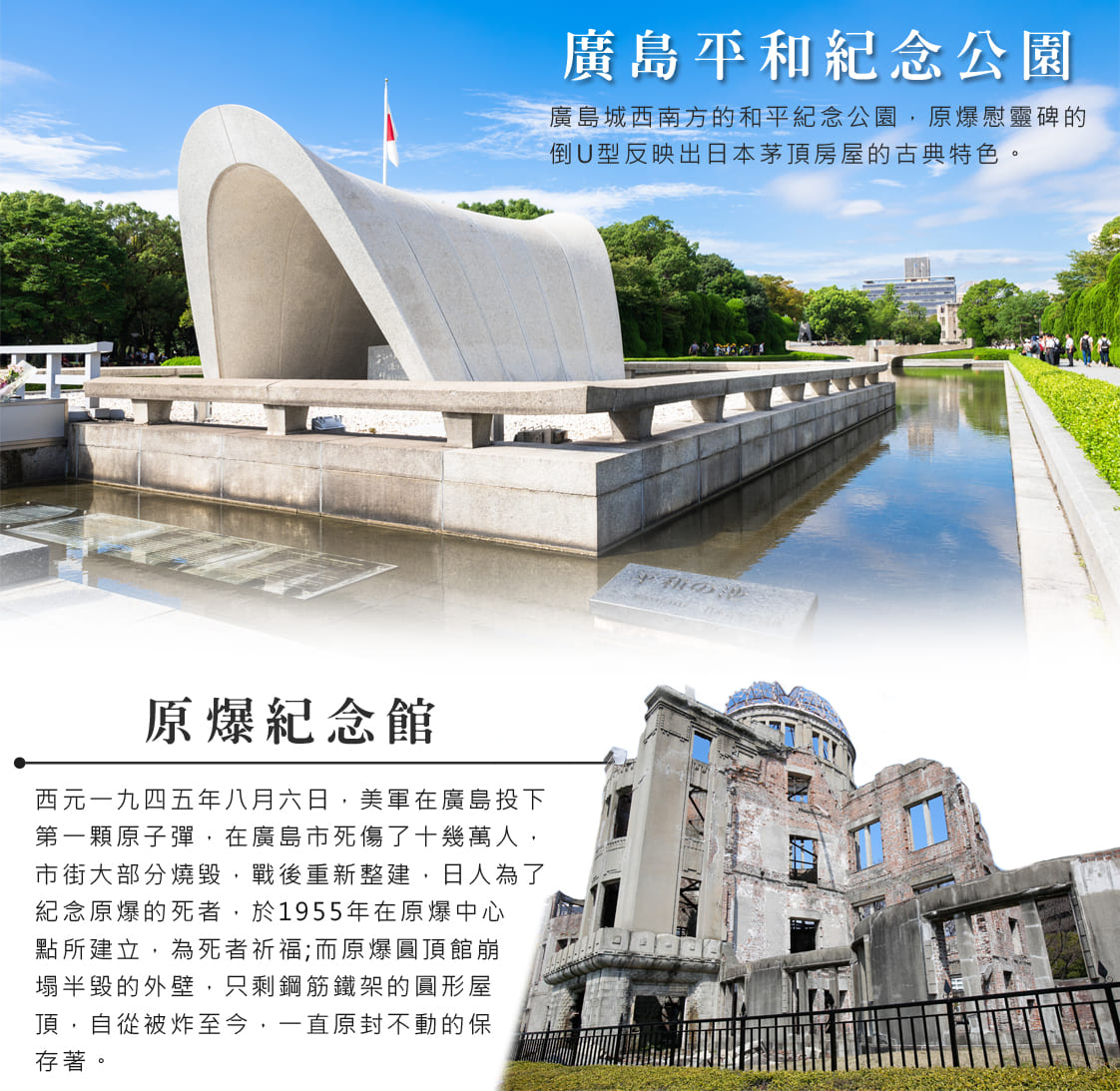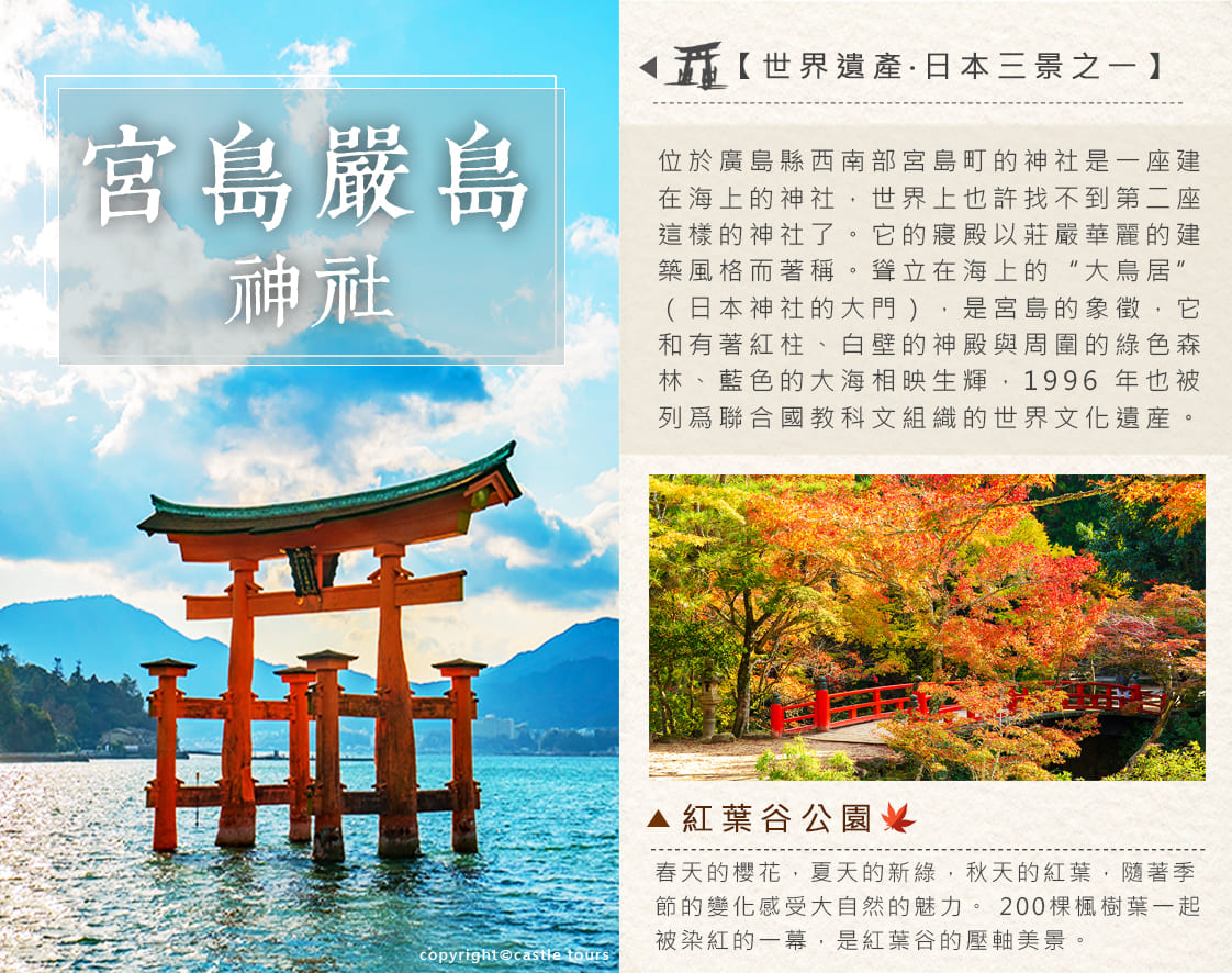 岡山🚌安藝小京都【竹原】江戶古街散策🚌『米其林三星景點』世界遺產~【宮島·嚴島神社·紅葉谷楓紅】(日本三景之一‧以建於海上神社及大鳥居聞名於世的神島)🚌世界文化遺產【廣島平和公園·原爆巨蛋】🚌廣島
