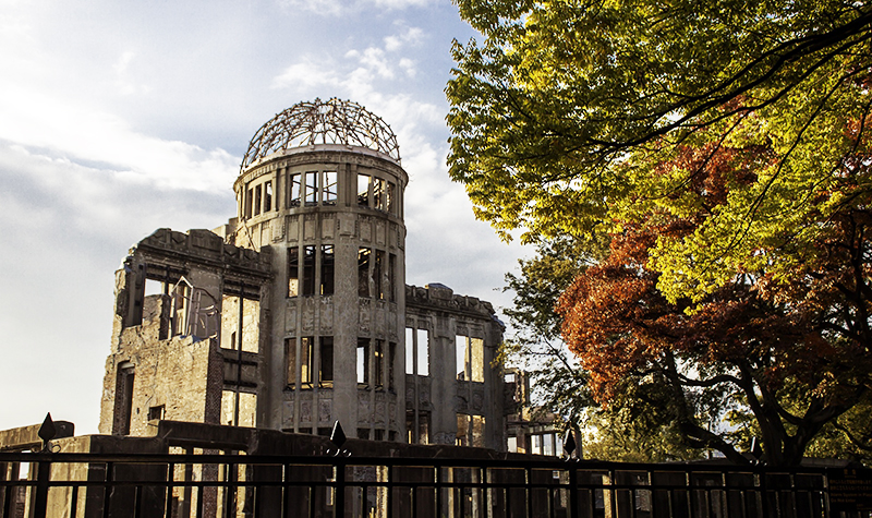 西元一九四五年八月六日,美軍在廣島投下第一顆原子彈,在廣島市死傷了十幾萬人,市街大部分燒毀,戰後重新整建,日人為了紀念原爆的死者,於1955年在原爆中心點所建立,為死者祈福;而原爆圓頂館崩塌半毀的外壁,只剩鋼筋鐵架的圓形屋頂,自從被炸至今,一直原封不動的保存著;館舍建於大正四年,原是廣島縣的產業獎勵館,當年只因它位在一座T字形「相生橋」在左方,遂成為盟軍投擲原子彈的目標。