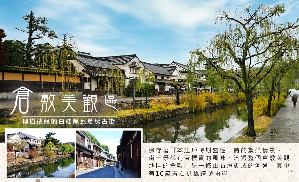 尚保存著日本江戶時期直轄地盛極一時的繁榮情景,一街一景都有著樸實的風味。流過整個倉敷美觀地區的倉敷川是1條由石垣砌成的河道,其中有10座青石拱橋跨越兩岸。兩岸儘是看不盡的楊柳與櫻花。漫步在古意盎然的純樸街道中,沿途可以欣賞商人們用於貯存貨物的白色牆壁的倉庫。19世紀下半葉,倉敷的商人開始積極吸收西洋文化,被視為倉敷文化象徵、擁有希臘風格的大原美術館就建於1930年。因為倉敷美觀地區保存狀態良好的日本江戶時期的宅戶、商店及倉庫等各有特色的優美建築呈現出江戶時期的日本風情,極富詩情畫意,因此人稱「美觀地區」,也使得這個地區被指定為「重要傳統建造物群保存地區」。