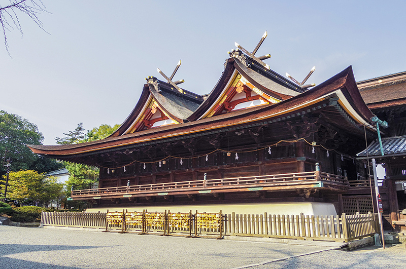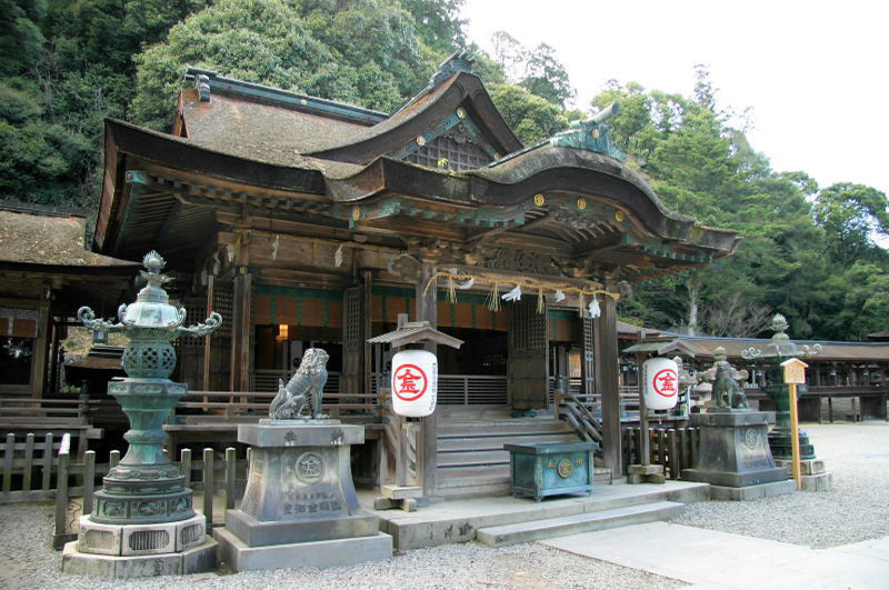 位於岡山縣倉敷市鶴形山頂,是倉敷地區的重要信仰中心。主祭神為宗像三女神,守護交通安全、海上平安、美容健康與技藝進步等多方面願望。境內最著名的是樹齡約300至500年的「阿智紫藤」,為岡山縣指定天然紀念物,每年五月盛開時吸引大量賞花人潮。此外,神社推出的蕾絲御守「花纏守」因其精緻設計與良緣寓意而廣受歡迎。登上神社可俯瞰倉敷美觀地區,感受古韻與自然交織的靜謐氛圍。