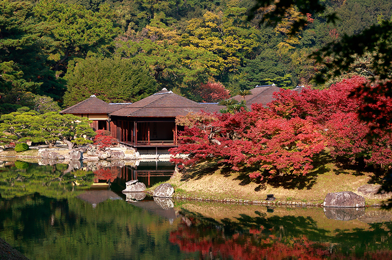 位於紫雲山東麓,是總面積約75萬㎡的大庭園,在四國地區唯一被指定為國家特別名勝。1625年左右起花費100年的歲月建造了庭園。庭園內分為南庭和北庭,南庭是回游式大名庭園,北庭是現代化庭園。庭園以紫雲山為背景巧妙配置了6個水池和13個假山,展現著一步一景富於變化的情景。以黑松為主,還有多彩的樹木、春季的櫻花、初夏.的蓮花和菖蒲、冬季的山茶等,不同的季節和時間有不同的韻味,可以觀賞各個時節的美景。南湖上架設著弧度優美的偃月橋,從東端的假山飛來峰眺望的、借景濃綠紫雲山的南湖、偃月橋和3島美景是栗林公園的代表性風景。