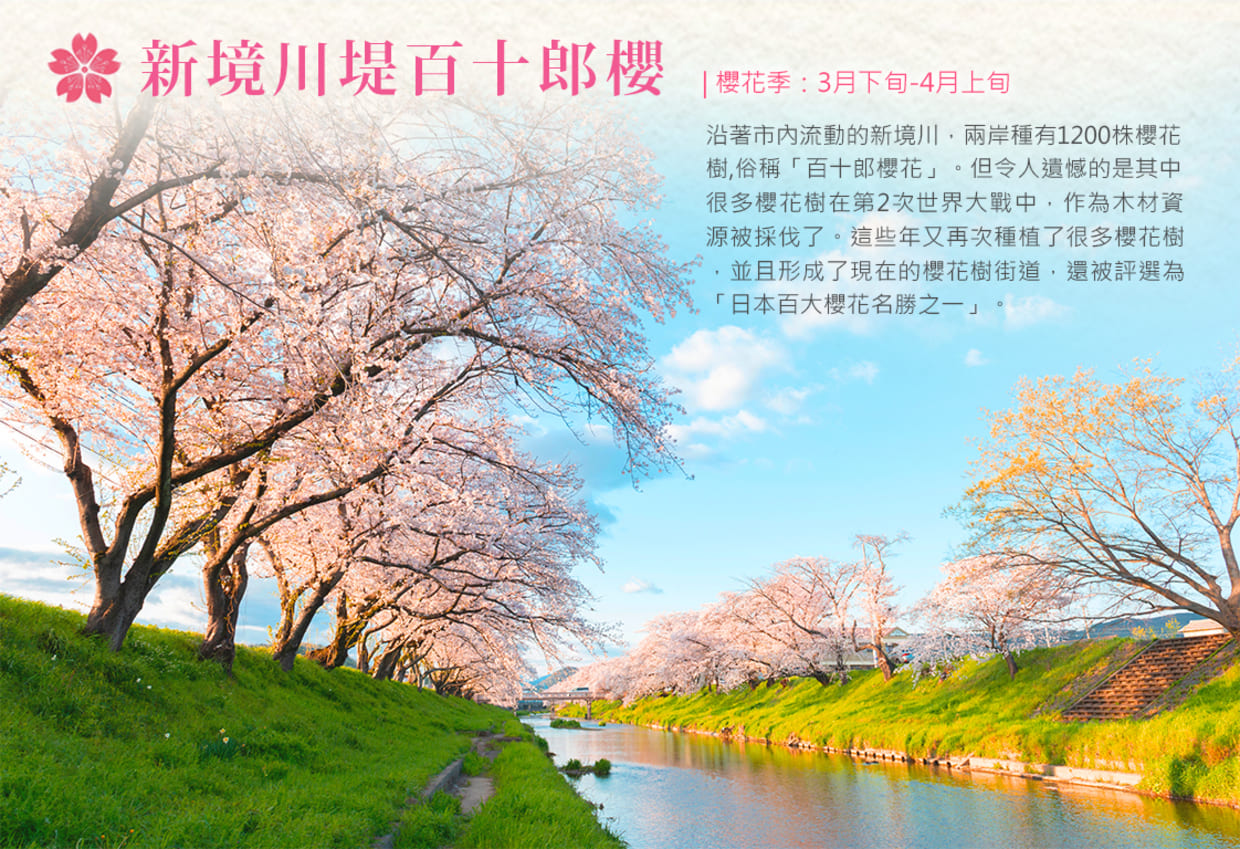 由當地出身的歌舞伎演員:市川百十郎,為紀念境川洩洪道開通所贈與,因此又有「百十郎櫻」之稱。新境川兩岸長達4公里約1000株以上盛開的成排櫻花樹,深受當地人歡迎。