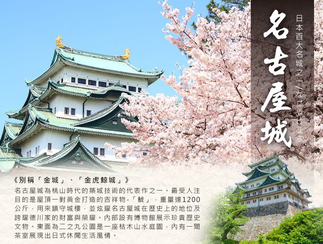 西元1612年(慶長17年)德川家康大抵掌握統治全日本,於是命其兒子德川義直由加藤清正等家臣協助,在名古屋興建造型宏偉的城堡,名古屋城為桃山時代的築城技術的代表作之一。最受人注目的是屋頂一對黃金打造的吉祥物-「鯱」,重量達1200公斤,用來鎮守城樓,並炫耀名古屋城在歷史上的地位及誇耀德川家的財富與榮耀。內部設有博物館展示珍貴歷史文物。東面為二之丸公園是一座枯木山水庭園,內有一間茶室展現出日式休閒生活風情。