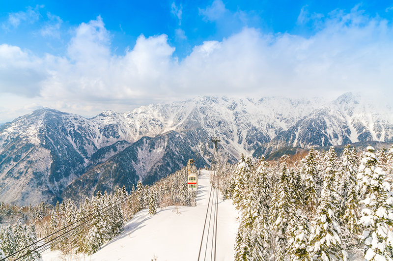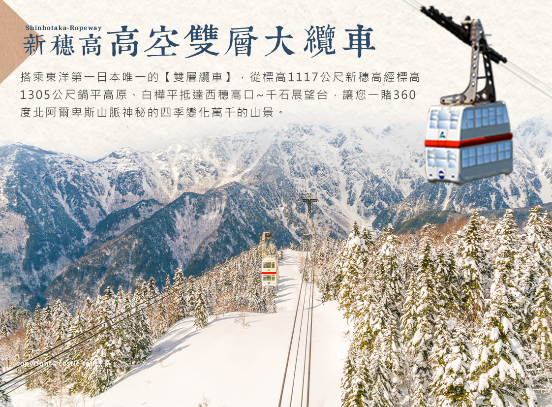 新穗高搭乘東洋第一日本唯一的【雙層纜車】,從標高1117公尺新穗高經標高1305公尺鍋平高原、白樺平抵達標高2156公尺的西穗高口~千石展望台,長達3公里的空中散步,讓您一賭360度北阿爾卑斯山脈神秘的四季變化萬千的山景。冬季山頂、千石園地出現巨大的「雪廊」!高達3公尺!週邊一片雪白的美麗世界,不可思議,請務必到此一遊。