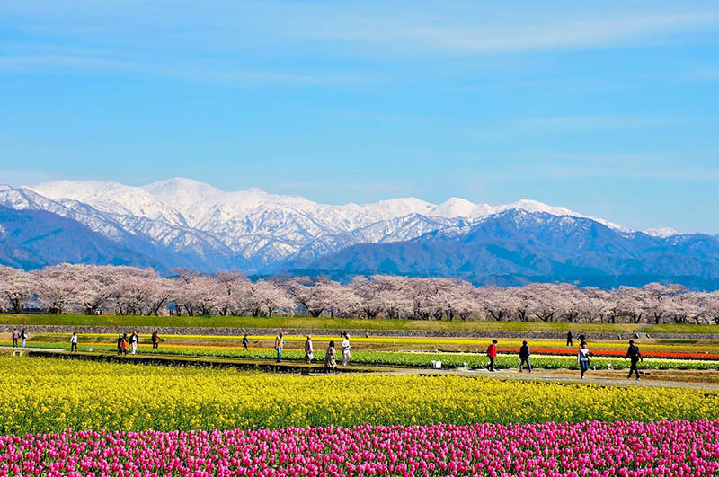 是由靄靄殘雪的北阿爾卑斯山脈、舟川堤岸的櫻花樹、色彩鮮艷的鬱金香,以及黃澄澄油菜花堆疊交織而成的絕美景色。是富山縣朝日町春季風物詩最為熱門的景點。舟川兩側共1,200公尺長的河岸綻放的280棵櫻花樹,是當地民眾親手種植,細心維護的成果。