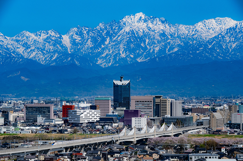 欣賞立山山脈連峰那攝人心魄的震撼全景!在這裡,向東您可以看到壯觀的立山山脈連峰,向北您能欣賞富山灣以及更遠處能登半島的景色。無論晴朗的白天亦或是夜晚,您都能在這裡欣賞到最棒的景色。同時,這裡也是一處賞櫻勝地。