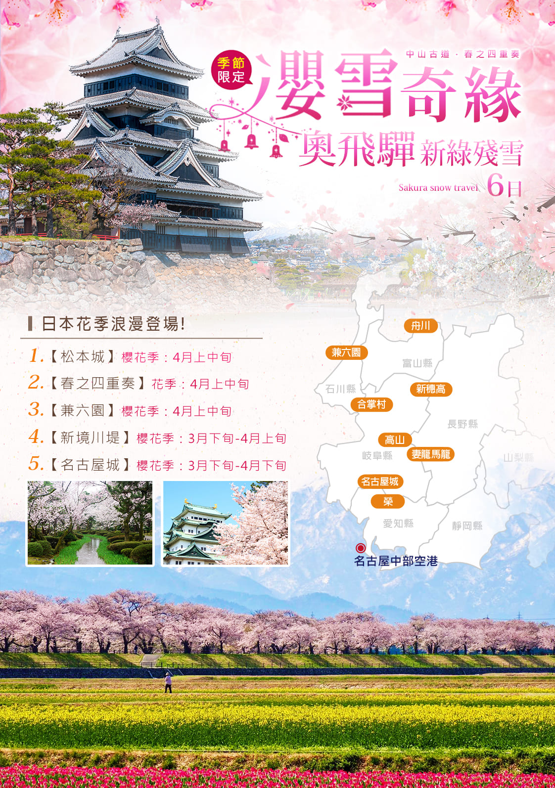 2026/03/30(一) | 高雄-小港機場出發 IT【櫻雪奇緣.奧飛驒】奧飛驒新綠殘雪.合掌村.兼六園.新穗高殘雪.中山古道.春之四重奏6日機位 25 候補0 已售0 可售24賞櫻不想太多人~就去北陸賞櫻價錢很超值哦~ |
