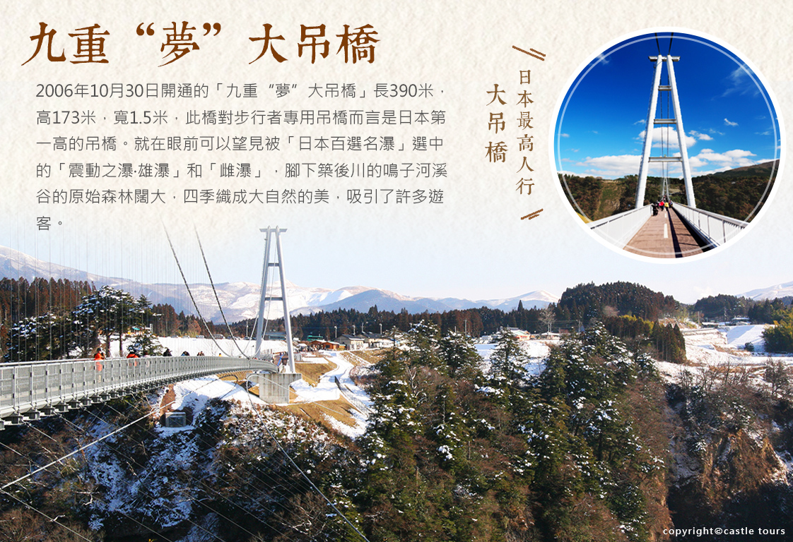是2006年開通的九重夢大橋是民間集資蓋,為了中村跟北方兩地的交通與振新經濟所蓋的,走在陸橋上便可以欣賞兩大日本美景,日本瀑布百選的震動瀑布及九醉溪溪谷景色。是大分縣裡相當具有人氣的景點。