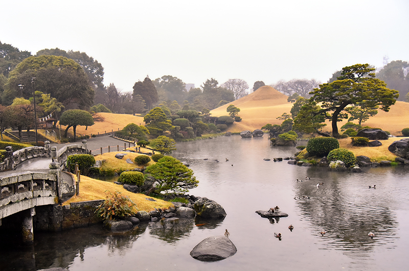 清澈的湧泉、優游的鯉魚,代表熊本的名園水前寺成趣園(俗稱水前寺院公園)是位於祭祀歷代細川氏的出水神社內的桃山式池泉迴遊庭園,建於大約360年前。水前寺成趣園以熊本籓第1代籓主細川忠利於日本寛永13年(1636年)作為待客飲宴而用所建築的「水前寺御茶屋」為起源,經過第3代籓主細川綱利增建泉水、築山等之後成為現在的形貌。水前寺成趣園名稱是引用自中國詩人陶淵明的「歸去來辭」中的一節「園日涉以成趣,門雖設而常關」。本園也以日本江戶時期由細川籓獻給江戶將軍家的貢品水前寺海苔的發祥地聞名。國家天然紀念物,國家名勝,指定史跡。