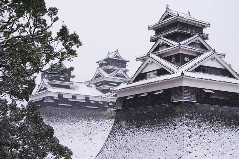 熊本城為加藤清正受封為熊本城主後於1601開始動工;1607年完工的日本三大名城之一。熊本城規模壯觀,是其牢不可破、堅不可摧的名城,其中以稱為「倒武者」的石牆最為出名。城內有許多銀杏樹,所以別名銀杏城,然於今年地震時遭受嚴重損害,目前已大致修護完成,返回往日風采。