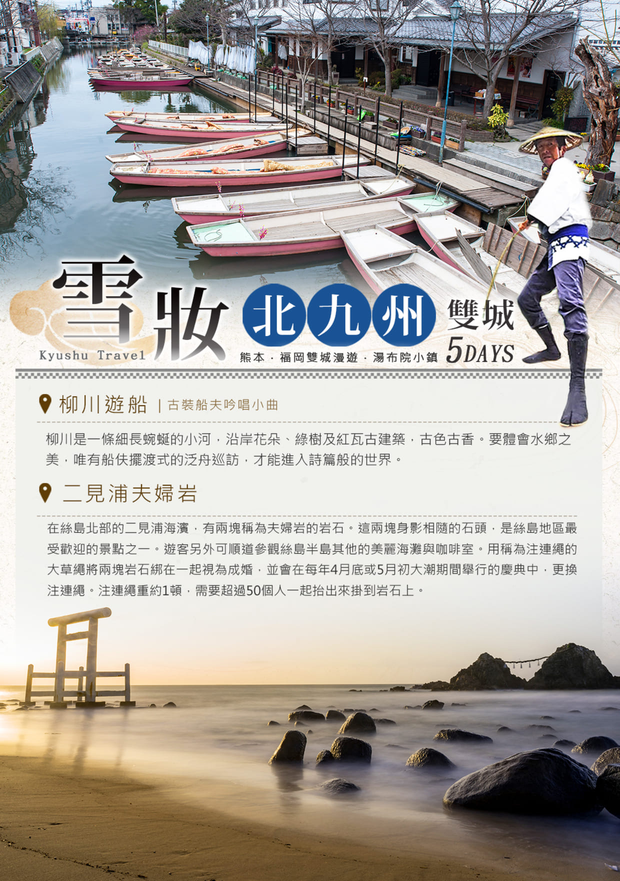 被稱為世界著名水鄉之一的柳川是城中環繞的人工河。在柳川市內縱横交錯,這條人工河原來有守城砦功能,同時也有各種各樣的功能;把過度的雨水暫時蓄存防止河水氾濫的放災功能;可以利用農業用水和消防用水等蓄水功能,對市民非常有利。柳川是一條細長蜿蜒的小河,沿岸花朵、綠樹及紅瓦古建築,古色古香,船伕擺渡式的泛舟巡訪,進入詩篇般的世界。
