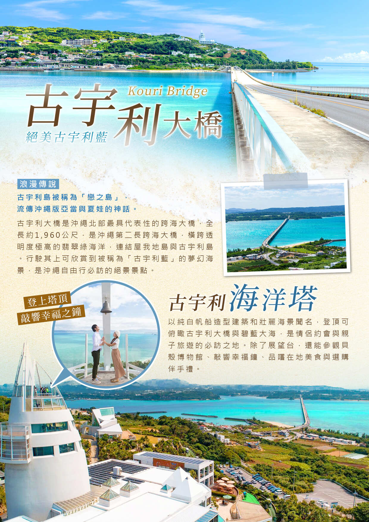 跨越美麗湛藍海洋且約2公里的大橋,連接著屋我地島及擁有沖繩版亞當與夏娃神話傳說的古宇利島。是沖繩縣內連接離島長度第二的大橋。「古宇利大橋」之美是沖繩屬一屬二的人氣景點。橋的另一頭是擁有人類發祥地之說的古宇利島,傳說中沖繩的亞當與夏娃-「Uminai與Umiki」,從天而降後在此生活繁衍後代。
