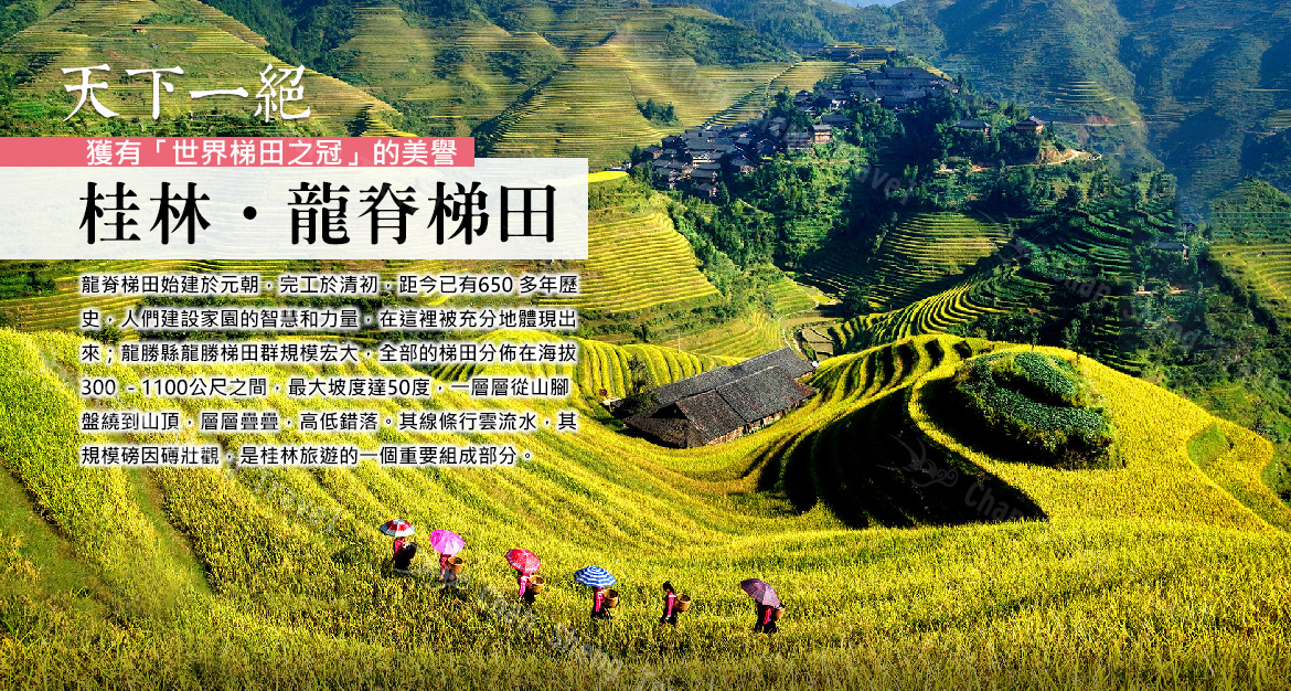桂林龍勝縣東南部和平鄉境內的龍脊山,有一個規模宏大的梯田群,如鏈似帶,從山腳盤繞到山頂,小山如螺,大山似塔,層層疊疊,高低錯落。其線條行雲流水,瀟灑柔暢;其規模磅礴壯觀,氣勢恢弘,有"梯田世界之冠"的美譽,這就是龍脊梯田。梯田如鏈似帶,把一座座山峰環繞成一只只巨大的螺螄,有的像巨扇一樣半摺半開,斜疊成一個個狹長的扇;有的則像天鏡被分割,然後有層次地鑲嵌成多種圖形的碎塊,在這個廣袤的方圍內,小路悠悠地,蜿蜒在跌宕有致的梯田裏,飄忽成一根根細繩,而嫋嫋地縈繞在它上空的龍脊壯族山歌,縹緲成一縷縷雲煙;那一幢幢被水光映照,被雲影拂弄的壯族"麻爛",則被空靈成仙宮了。