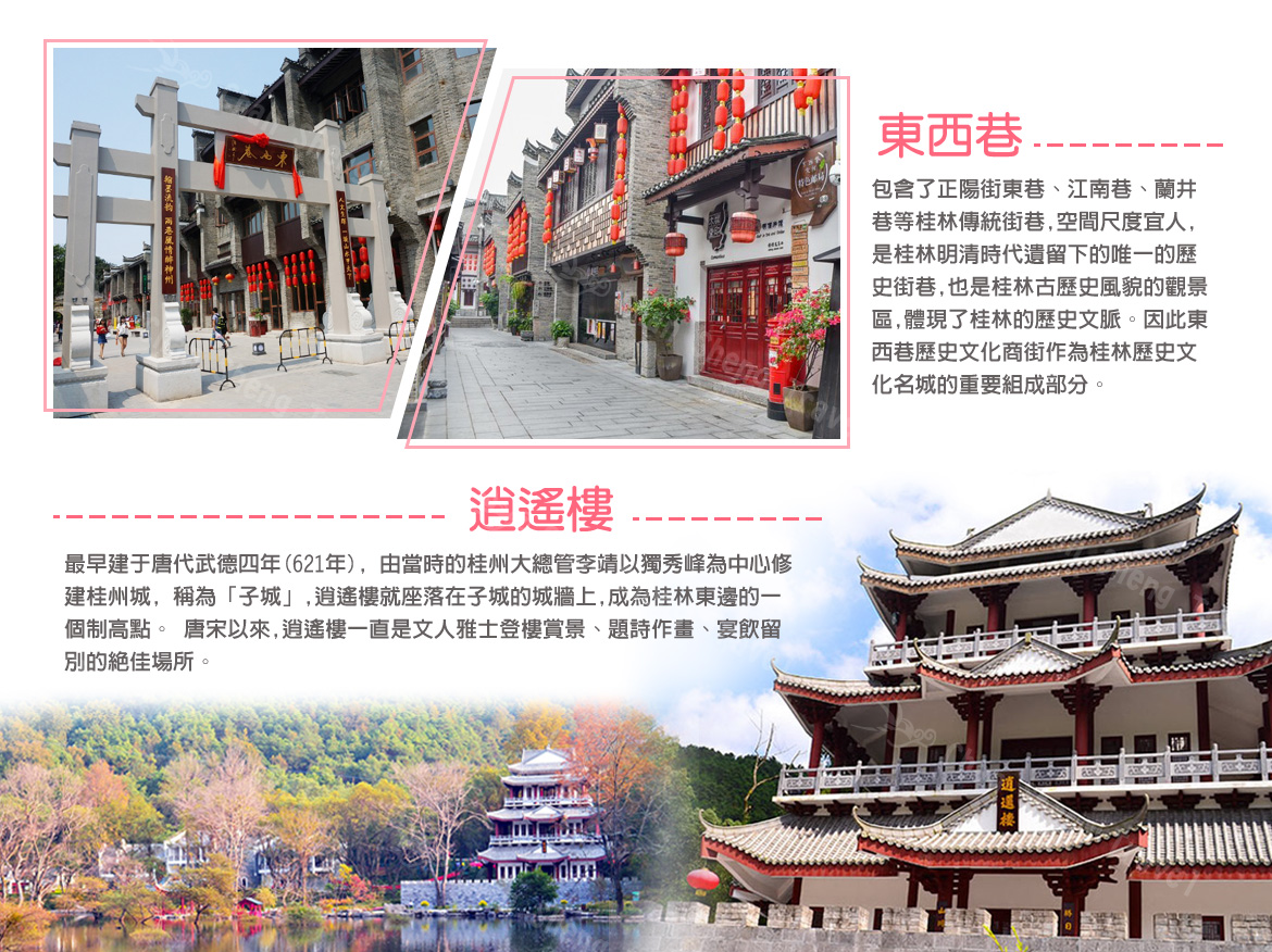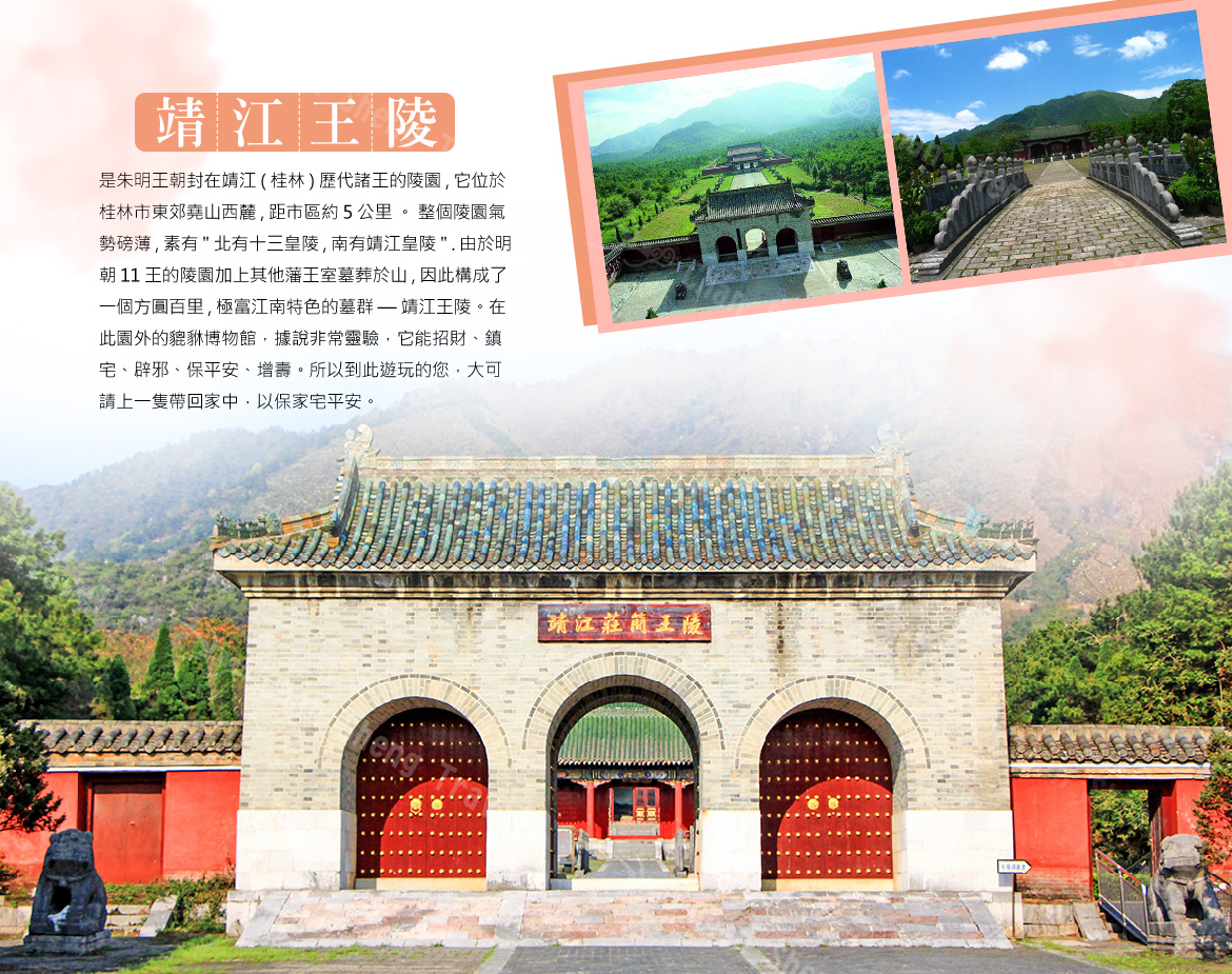 【靖江王府+體驗王府科舉考試】靖江王城始建於1372年,規模宏大,門深城堅,佈局嚴謹,氣勢森然。殿堂巍峨,亭閣軒昂,水光山色,恍如仙宮,比北京故宮早建34年,它還是南京故宮的精華縮影。明朝共有12代14位靖江王居住於此,歷時280年。獨秀峰與桂林著名的疊彩山、伏波山三足鼎立,是桂林主要山峰之一,相對高度66米。由3.5億年前淺海生物化學沉積的石灰岩組成,主要有3組幾乎垂直的裂隙切割,從山頂直劈山腳,通過水流作用,形成旁無坡阜的孤峰。獨秀山體扁圓,東西寬,端莊雄偉,南北窄,峭拔峻秀,有南天一柱之譽。