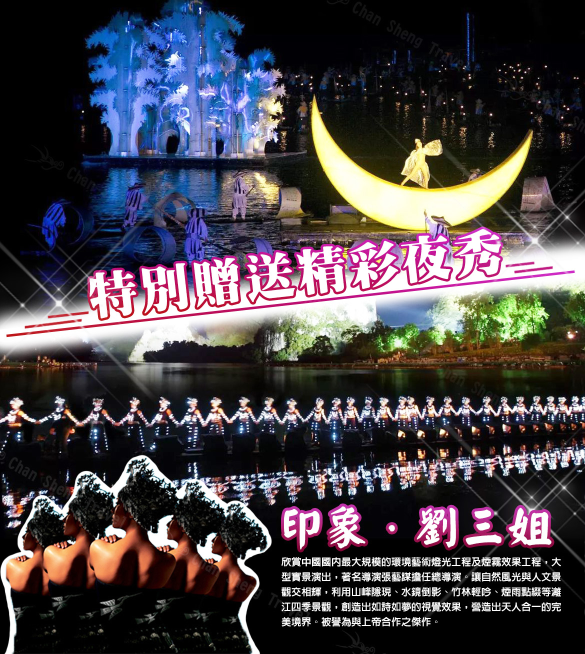 【印象劉三姐-新貴賓席】以桂林山水實景作為劇場。 在江面上有可以隨意變化的中心舞台,以 12 座連綿起伏的山峰為背景,打破了傳統在劇院有限空間的局限,堪稱是「人與上帝共同的創作」。江面上設有兩個移動的大螢幕,穿插播放電影《劉三姐》的經典場景和山歌,以此為主演出融合壯族風情、漓江漁火等元素的創新組合,並配以變幻莫測的燈光,創造出天人合一的境界。