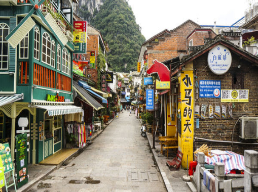 【西街】陽朔西街是一個濃縮華夏精華的中式小鎮。西街上的西式攤店擺掛的都是中華民族的傳統飾物,如景泰藍色圖騰的布染,人工刺繡的荷包、掛帶、不同式樣的中國結和平安福。一間連著一間,處於這山水交加和天地靈氣的自然小鎮,吸引著成千上萬的急於瞭解中國的外國人,這種情結,像中國結般系在街道每個角落。洋人們在這裏開飯店、咖啡店,在陽朔小鎮上盡情地渲染著溫暖的小資情調。