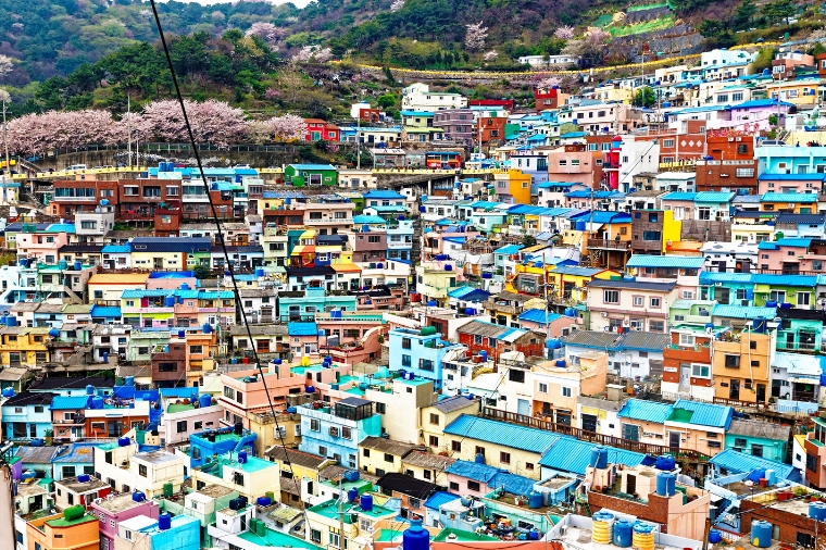 【甘川洞文化村】夢之城釜山的馬丘比丘“藝術工廠多大浦”的公共項目建設讓老城區脫胎換骨。將沙下區甘川二洞一帶的空房和巷弄改造成小區歷史畫廊和酒吧等,重新創造夢之文化藝術平臺。彩色的房子層疊出別具特色的景致,是一個適合探索、拍照的好地方。