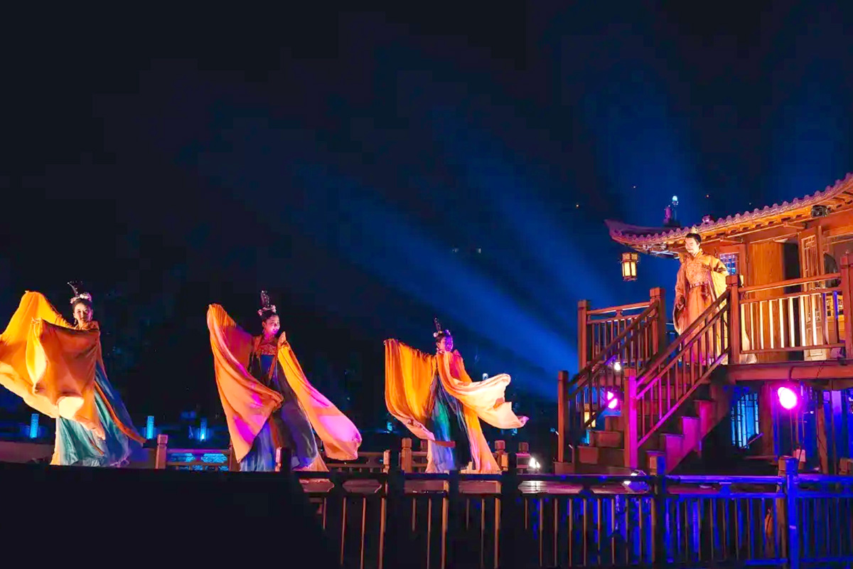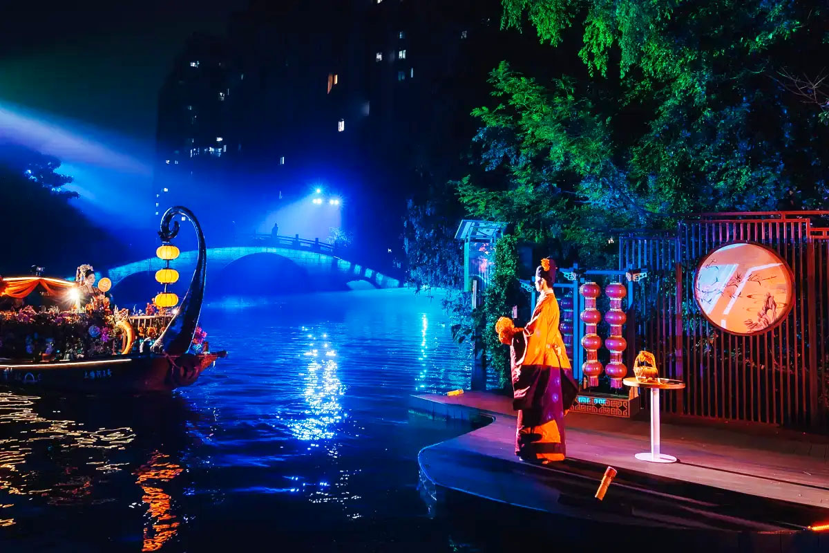 【如夢上塘夜秀】《如夢上塘》是大型宋詞文化主題水上實景演出。演出提取五代至南宋九位詞人的故事,演出時長約60分鐘,八大篇章,十大場景,由國內知名藝術團隊傾情打造和演繹。演出採用全新“行進+沉浸”式觀演模式,並將戲劇、電影、水幕、光影、裝置等藝術巧妙地融於一體,帶來真人實景與水幕光影相結合的視覺盛宴,讓觀者感受“人在船中坐,船在畫中游”的別樣體驗。