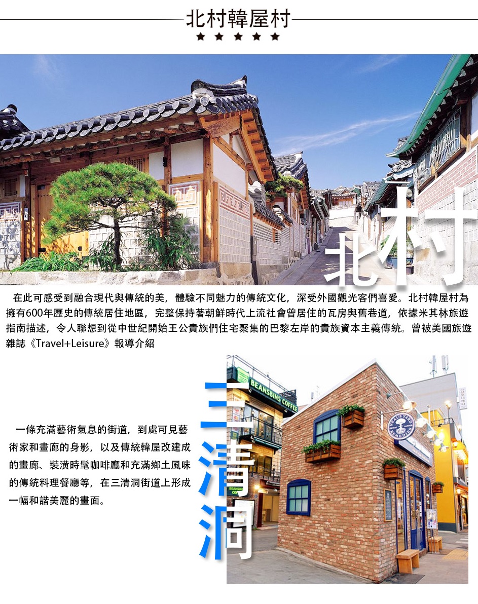 位於景福宮、昌德宮和宗廟之間區域,是隨同首爾600年歷史一同流傳下來的韓國傳統居住型態建物。緊鄰兩大宮闕之間的傳統韓屋聚落,完善保留各式樣貌的小巷道,更可巨細靡遺的觀覽600年歷史都市的迷人風貌。至今還可隨處看到殘留下來的幾戶韓屋仍舊保留著昔日的那份名聲威望。許多戶韓屋的屋簷堆疊、和鄰家共用一道牆的景致,也可以讓遊客感到那份被遺忘已久的溫暖情分。漫步在北村也可見家家屋簷連延不斷的傳統美感,更能體認到巷道內的淳樸情感。