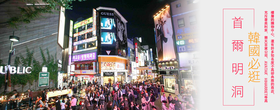 【明洞商圈購物樂】明洞位於首爾市中區,是首爾具代表性的著名觀光景點之一,也是流行時尚的重鎮。許多年輕人都喜歡相約在此出遊。不僅可以購買服裝、鞋類、飾品等,還有非常多有名的餐廳及銀行和證券公司雲集於此。明洞的商品以中高檔為主。明洞大街兩旁有各式各樣的商店及綜合大型購物中心。