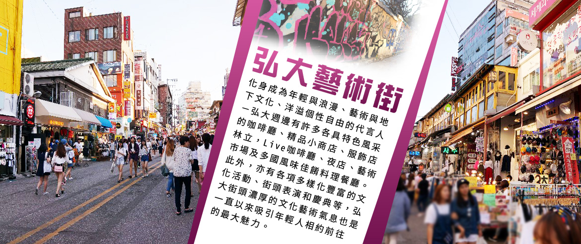首爾市的年輕人,在選定約會場所時,最常選擇的就是弘大、梨大、江南等地方。以美術大學聞名的弘益大學一帶,附近有許多外國人聚集的咖啡廳,是結合青春與藝術空間,又被譽為畢卡索街。這裡有許多風格獨特咖啡廳,融合成異國情調,在這裡散步就能讓人完全沉浸到藝術氣氛中。