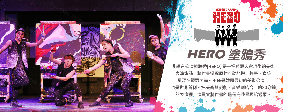 【新塗鴉秀 THE PAITERS HERO2】新概念藝術表演「塗鴉秀」大規模升級!嶄新且華麗的現場繪畫,與尖端媒體藝術相結合,打造出全新概念的藝術表演:「新塗鴉秀」,正式重新開演!比過往陣容多出兩倍的專業演員,華麗的肢體演出,搭配超豪華立體影像與現場演奏,即將在觀眾面前重現各種世界名畫!