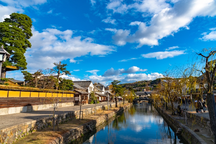 【倉敷美觀地區】保存著日本江戶時期直轄地盛極一時的繁榮情景,一街一景都有著樸實的風味。流過整個倉敷美觀地區的倉敷川是1條由石垣砌成的河道,其中有10座青石拱橋跨越兩岸。兩岸儘是看不盡的楊柳與櫻花。漫步在古意盎然的純樸街道中,沿途可以欣賞商人們用於貯存貨物的白色牆壁的倉庫,至今尚保存著的貨場、大八車(過去運送物資的車)通行的石板路、相當於古時的路燈的常明燈等等,反映出當時的繁榮景象。19世紀下半葉,倉敷的商人開始積極吸收西洋文化,被視為倉敷文化象徵、擁有希臘風格的大原美術館就建於1930年。