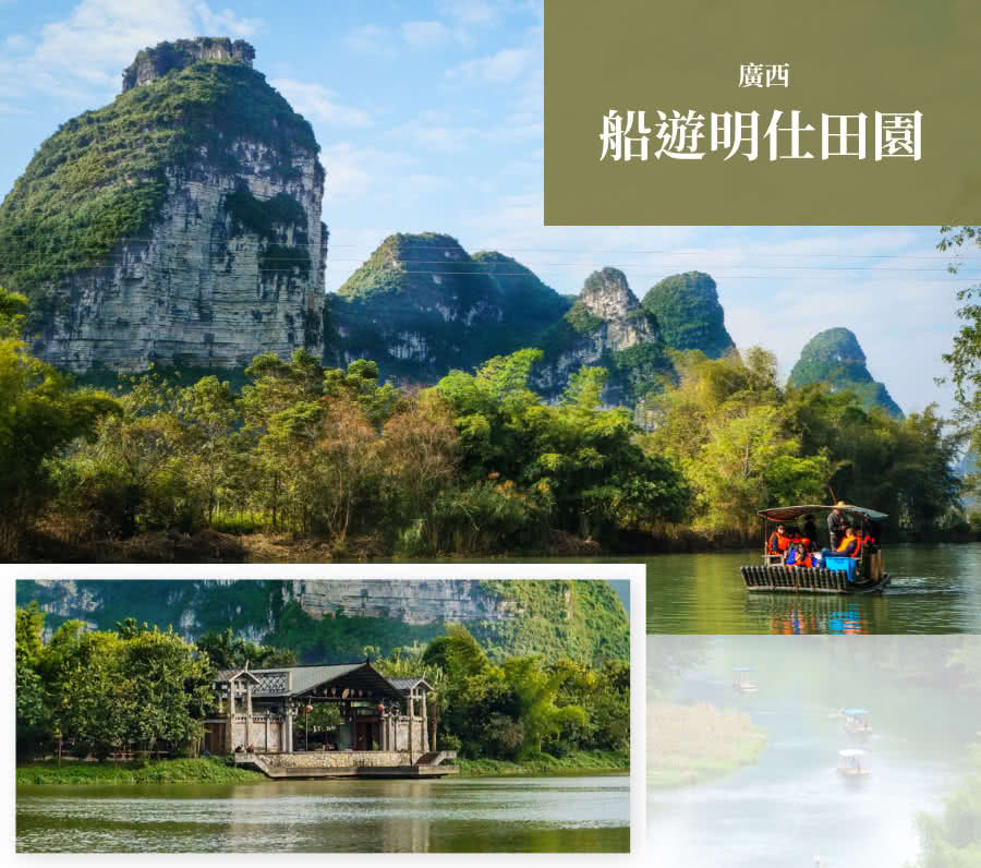 【世外桃源~明仕田園含船遊(入內參觀)】山明水秀,風光俊朗清逸,有『隱者之居』美譽及小桂林之稱『明仕田園』。這裡是攝影的天堂,同一地方就可以欣賞日出和日落的絢麗景象,也是著名的影視拍攝地,『牛郎織女』、『本草葯王』等大陸多部優秀影視作品都在此地拍攝。跟著美麗的的壯族阿妹沿著小路往碼頭走去,只見翠竹繞岸,農舍點,獨木橋,稻穗搖曳,極富南國田園氣息。我們分乘兩艘竹排,順著明仕河漂流而下,聽著壯族阿妹細細為我們解說,看著遠處美麗的山峰,兩岸翠竹綠樹、明鏡似的小河及耳邊不時傳來的清脆鳥鳴,讓我們沈浸在這寧靜和諧的氣氛中,真乃人生一大享受。