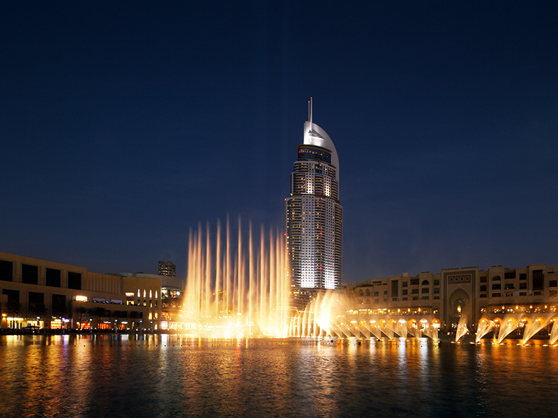 杜拜音樂噴泉(Dubai Fountain)是世界最大的噴泉,它的總長度為275米,最高可以噴到150米,相當於一棟50層樓的高度。該噴泉會噴射2.2萬加侖的水,並配有6600個燈光以及50個彩色投影機。噴出的水柱有1000多種變化,可以說是名副其實的千變萬化。伴隨著數首阿拉伯以及來自世界各地的歌曲,噴灑的水柱像是在人們面前跳著優雅的舞蹈,每一場使用的音樂不同、編排的舞姿也不同,一會像一群苗條少女婀娜多姿、翩翩起舞;一會像一列武士整齊劃一、高亢有力;一會噴出所有水柱氣勢磅礡、雄偉壯麗。
