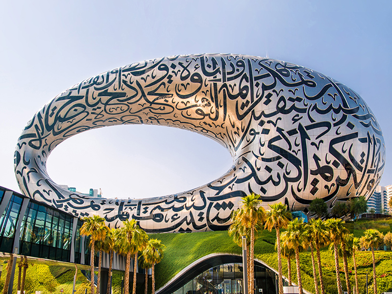 特別的是,上頭的圖紋藍本源自現任杜拜謝赫、同時也是阿聯總理Sheikh Mohammed bin Rashid Al Maktoum的書法線條,整段話大意為:「人類壽命雖有限,但因創造力而生的產物將會流傳於世;未來屬於具想像、設計與執行能力的人,它不靠等待、必須自行創造,而創新正是國家與人民進化背後的秘密。」整體建築從外觀、製程到寓意都別具未來感,與場域命題緊緊扣合。