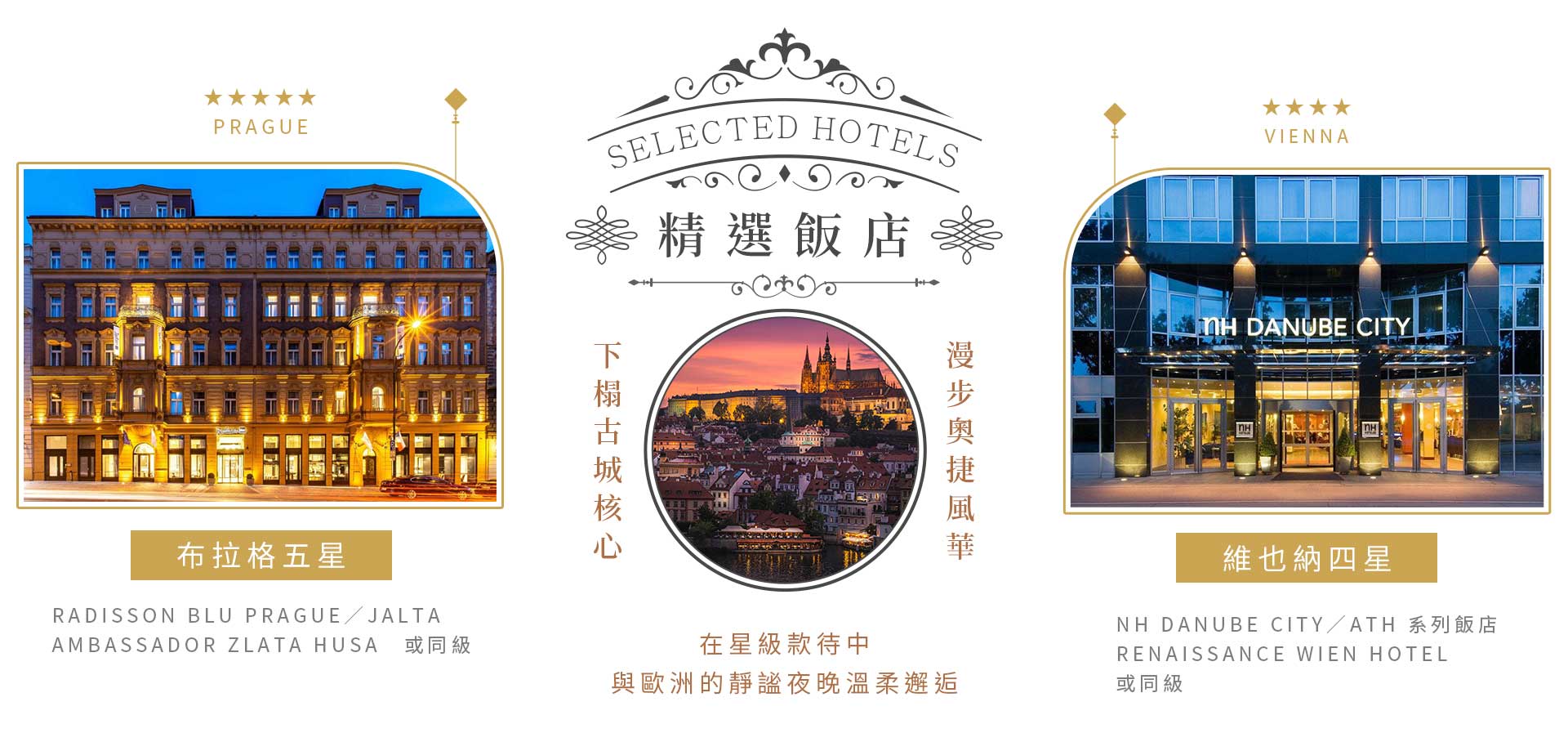 住宿:RADISSON BLU PRAGUE 或 JALTA 或 AMBASSADOR ZLATA HUSA 市區五星級或同級 或同等級