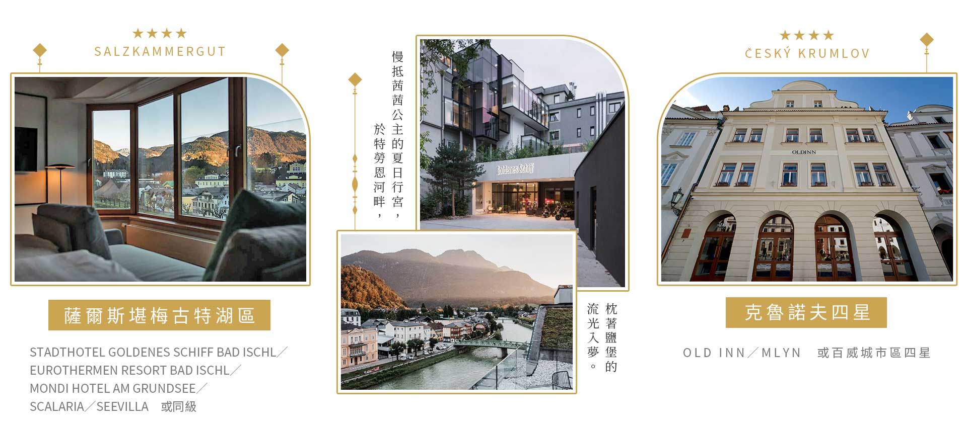 住宿:STADTHOTEL GOLDENES SCHIFF BAD ISCHL 或 EUROTHERMEN RESORT BAD ISCHL 或 MONDI HOTEL AM GRUNDSEE 或 SCALARIA 或 SEEVILLA 或同等級