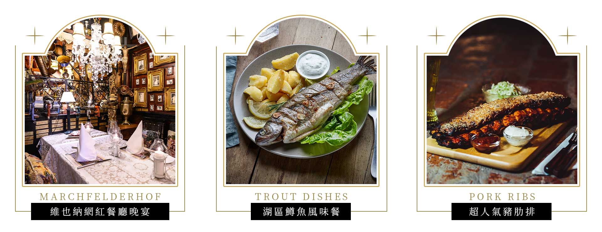 走進 Marchfelderhof,彷彿踏入劇院道具倉庫:牆上掛滿古董、老照片、戰績勳章、樂器、帽子,裝飾密到沒有一寸空白,越看越像在挖寶。服務生穿著傳統服飾,還會用小號、鈴鼓等樂器炒熱氣氛。用餐體驗充滿儀式感,從迎賓香檳、拍照留念,到特色家鄉料理,每一道都份量十足。這裡不只是吃飯,而是一場熱鬧、歡樂、具有奧地利鄉村風情的「沉浸式用餐秀」。