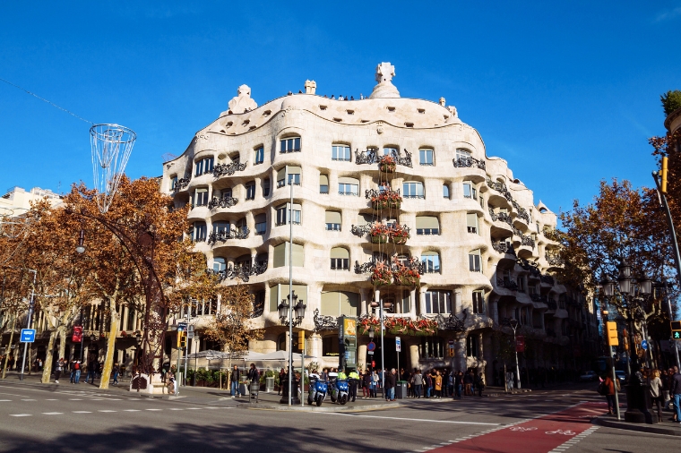 【米拉之家下車參觀】富豪佩雷米拉(Pere Milà)因非常欣賞巴特婁一案而委託高第設計的住宅大樓,同時也是高第的最後一件私人住宅作品;其特殊之處除了在於建築重量完全由柱子承受的結構設計,讓每間房子都得以享受大面積的採光玻璃,以及更具彈性隨意的空間改造,讓米拉之家的內部每一戶都能雙面採光,光線由採光中庭和外面街道進來,而房間的形狀也幾乎全是圓型設計,天花板、窗戶、走廊,幾乎沒有矩形的設計。米拉之家於1984年被列為世界遺產,同時宛若外星生物般、有趣的屋頂與煙囪設計,更據傳是大導演喬治盧卡斯發想《星際大戰》(Star Wars)系列作品的靈感來源