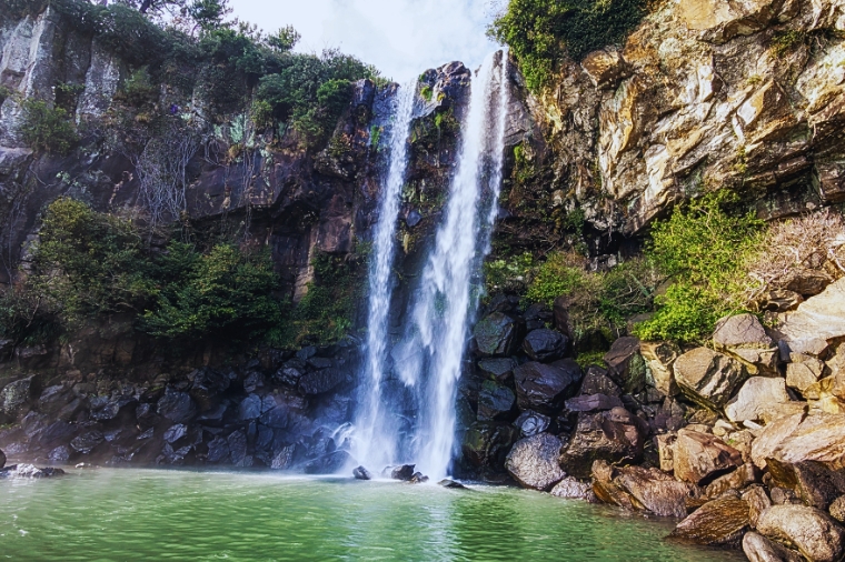 【正房瀑布】位於西歸浦市區東南方約1.5公里處的正房瀑布,與天地淵瀑布、天帝淵瀑布並稱濟州島內三大瀑布。作為瀑布水直接落入大海的東洋唯一海岸瀑布,高23公尺、寬8公尺、深5公尺。