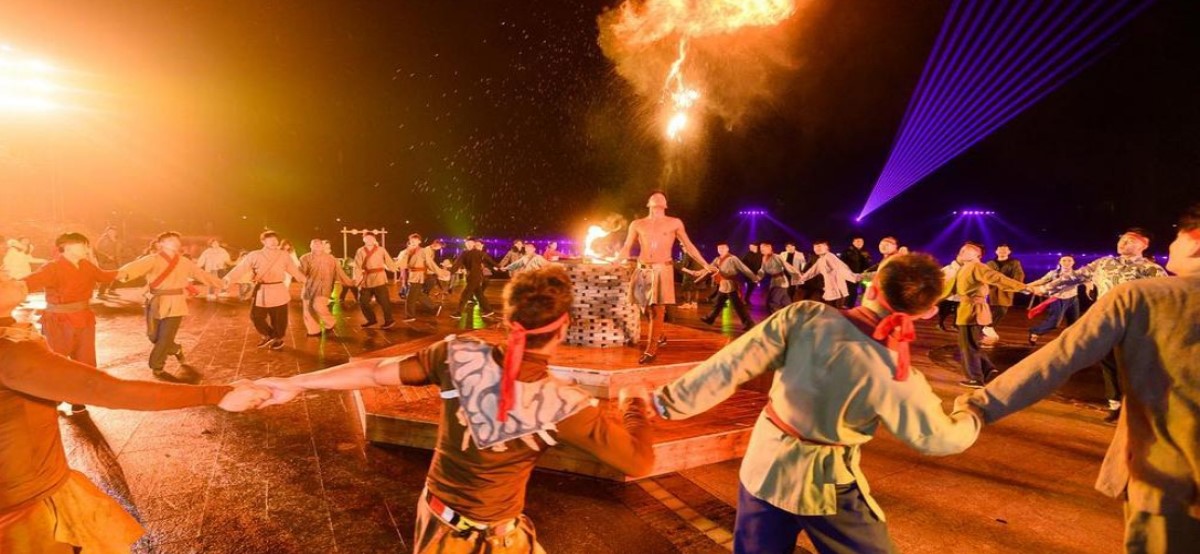 【晨鐘暮鼓】白雲湖畔的祭祀盛景,晨鐘暮鼓喚醒了山民與山神,通過古典舞蹈表演中水袖、擊鼓等,上演氣勢恢宏的山水實景演出。