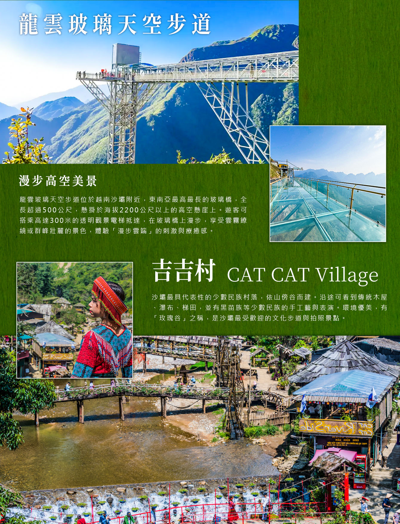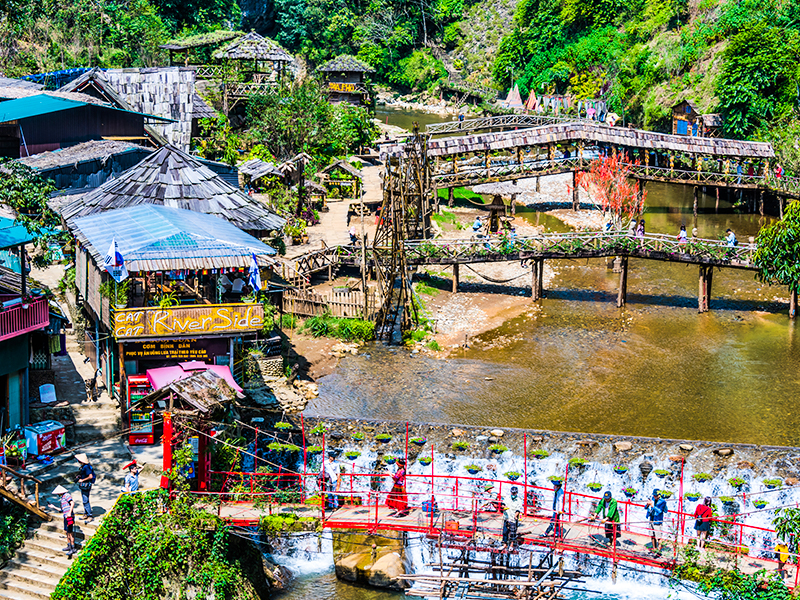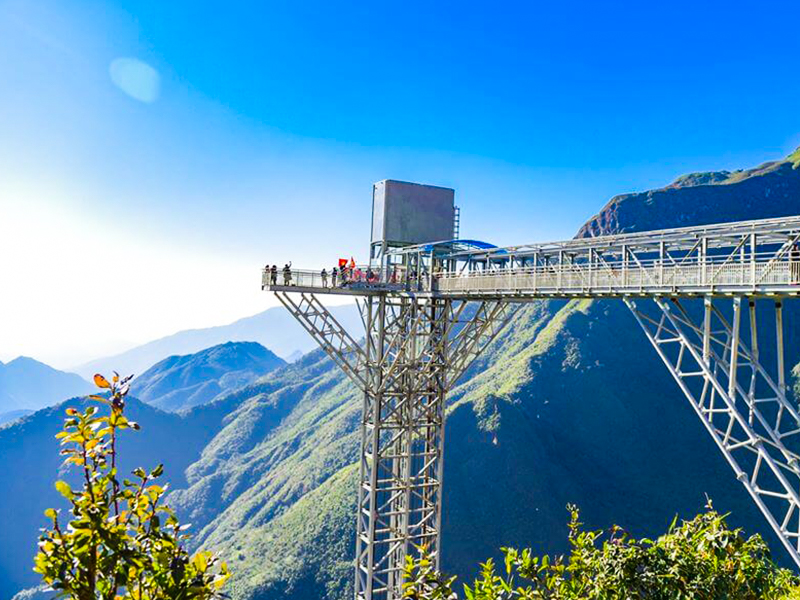 越南北部最刺激的高空體驗。透明玻璃橋橫跨山谷,腳下是深邃山脈景色,四周被雲霧圍繞。站在橋上可俯瞰整個沙壩山群,是熱門的高空打卡地標,視野震撼、適合拍照留念。