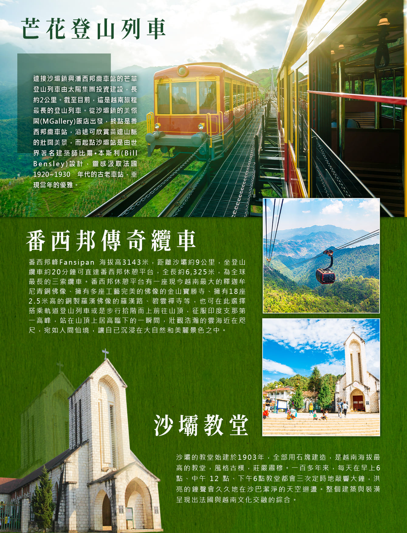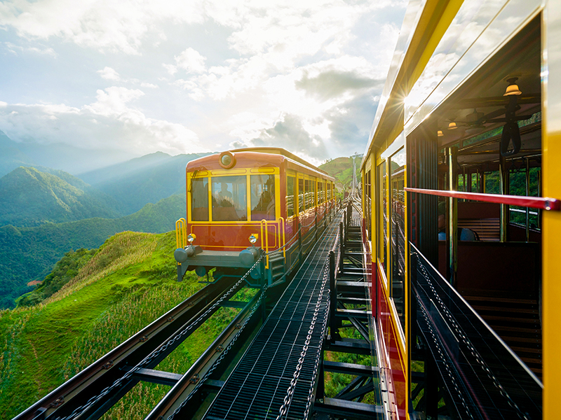 【芒花登山列車】連接沙壩鎮與潘西邦纜車站的芒華登山列車由太陽集團投資建設,長約 2 公里。截至目前,這是越南旅程最長的登山列車。從沙壩鎮的美憬閣(MGallery)飯店出發,終點是番西邦纜車站,沿途可欣賞黃連山脈的壯闊美景,而起點沙壩站是由世界著名建築師比爾•本斯利(Bill Bensley)設計,靈感汲取法國1920~1930 年代的古老車站,重現當年的優雅。