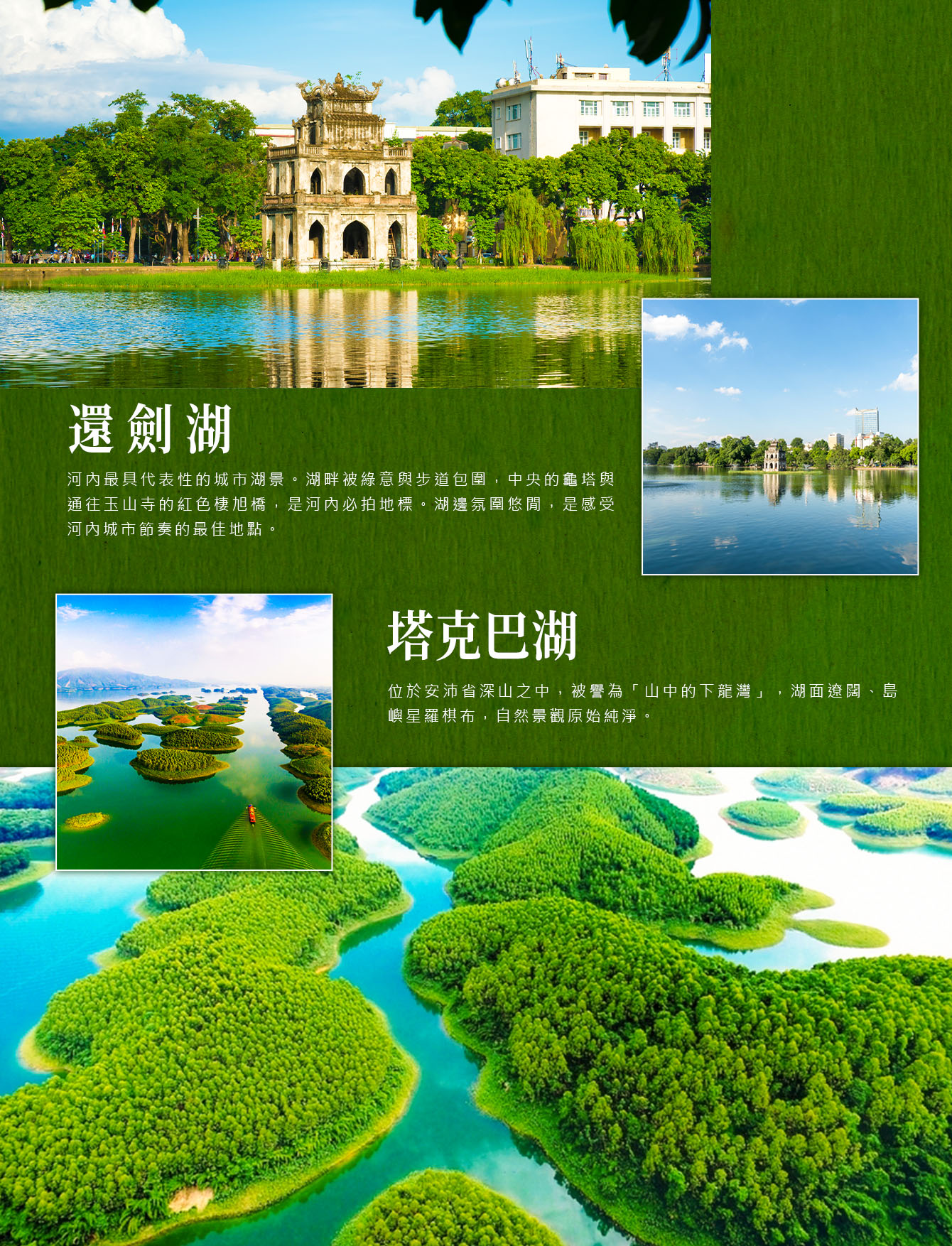 塔克巴湖位於安沛省深山之中,被譽為「山中的下龍灣」,湖面遼闊、島嶼星羅棋布,自然景觀原始純淨。