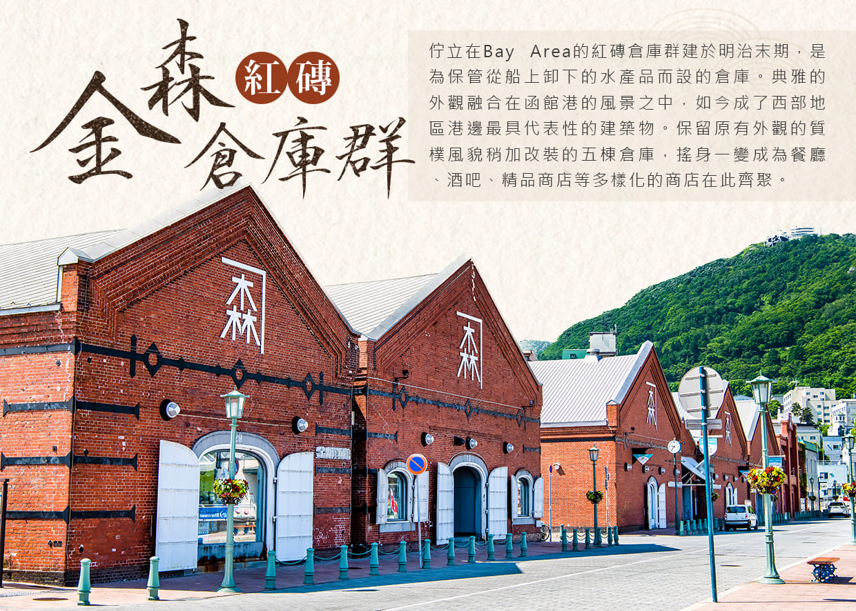 佇立在Bay Area的紅磚倉庫群建於明治末期,是為保管從船上卸下的水產品而設的倉庫。典雅的外觀融合在函館港的風景之中,如今成了西部地區港邊最具代表性的建築物。保留原有外觀的質樸風貌稍加改裝的五棟倉庫,搖身一變成為餐廳、酒吧、精品商店等多樣化的商店在此齊聚。