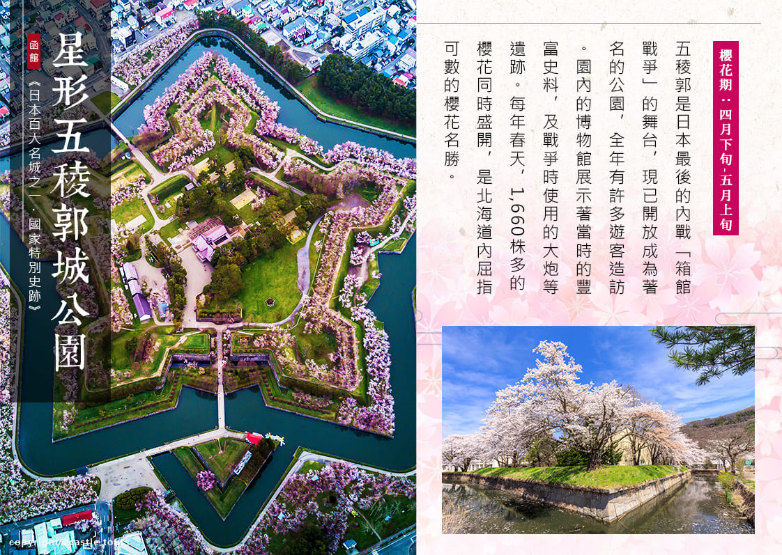 建於江戶時代1864年,是德川幕府參考歐洲星形要塞設計而成,當時為日本北方政治、外交、防衛中心。五稜郭也是德川幕府最後的城池,1869年箱館戰爭中德川軍在此敗給明治政府,正式宣告了日本封建制度的結束。五稜郭公園中央的「箱館奉行所」是當年函館政府中樞,不過在箱館戰爭後遭到解體,目前建築為2010年重建。