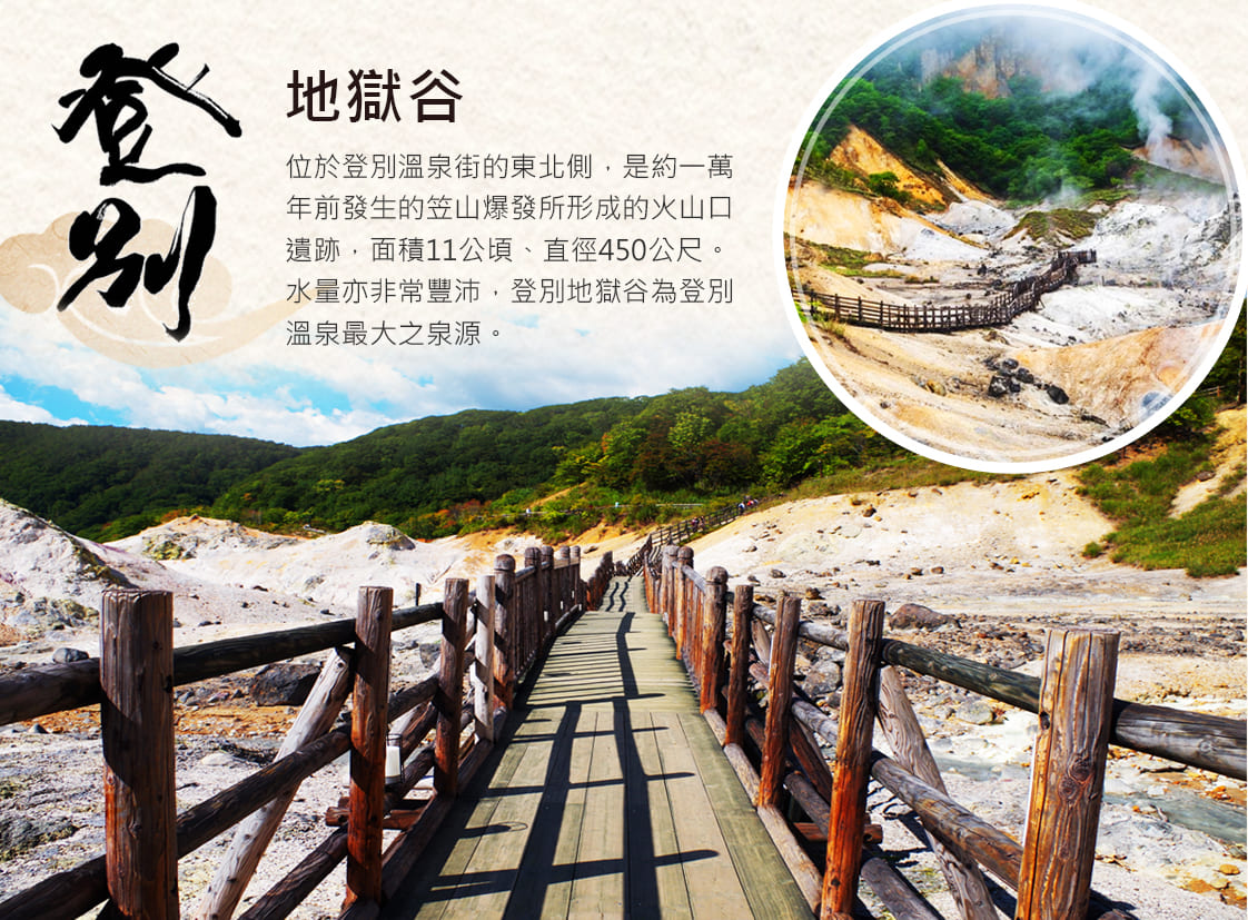 登別溫泉為日本溫泉度假勝地的代表。以每天約1萬噸出量的登別溫泉水、源源不斷地流進溫泉街的各家飯店與旅館。擁有多種溫泉是登別溫泉其最大的魅力,因而被稱為「溫泉百貨公司」,21世紀是個講求「療效」的時代,浸泡在蘊含豐富成份的登別溫泉裡,則能夠發揮最大療效的最佳方法,也贏得了「北海道第一溫泉名鄉」的美稱。**當飯店住宿千歲或苫小牧時則取消登別溫泉溫泉街散策**