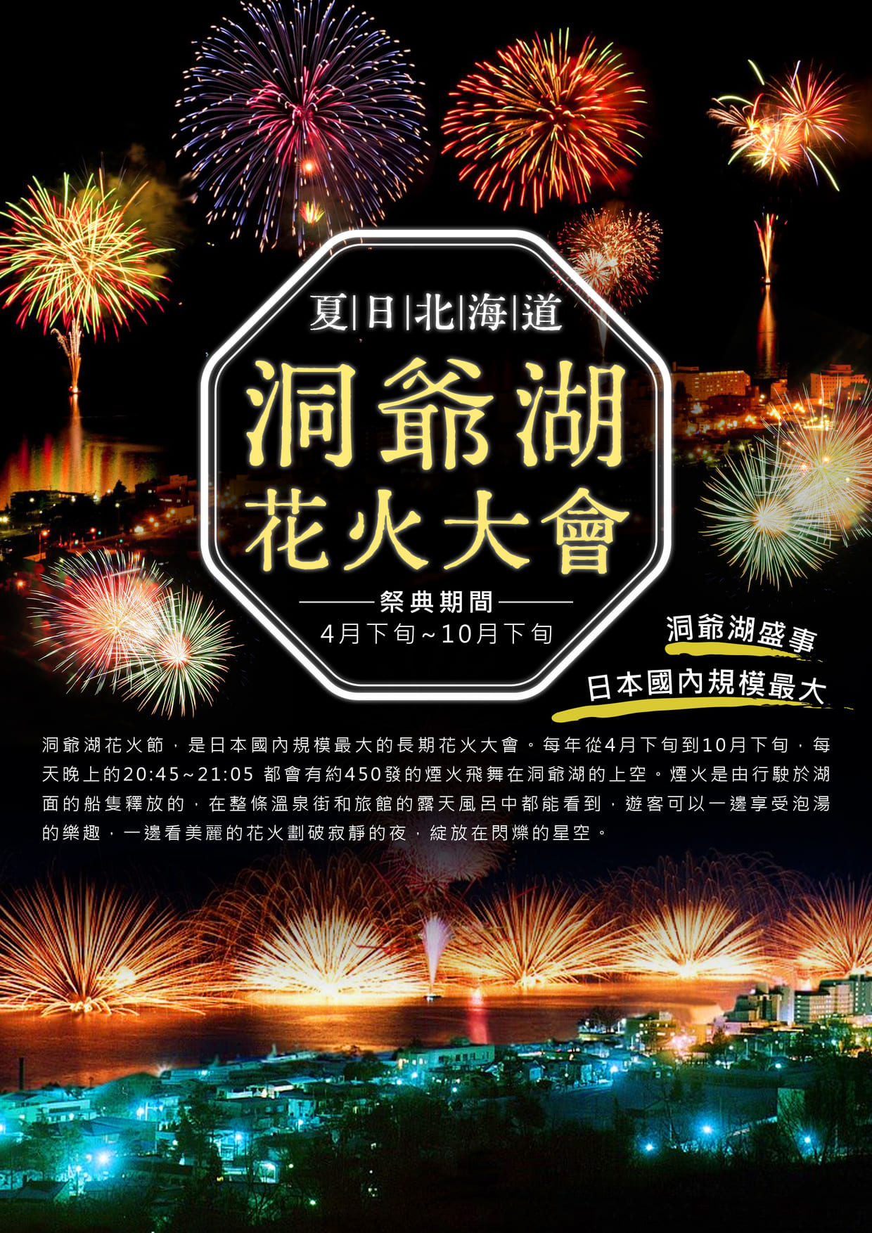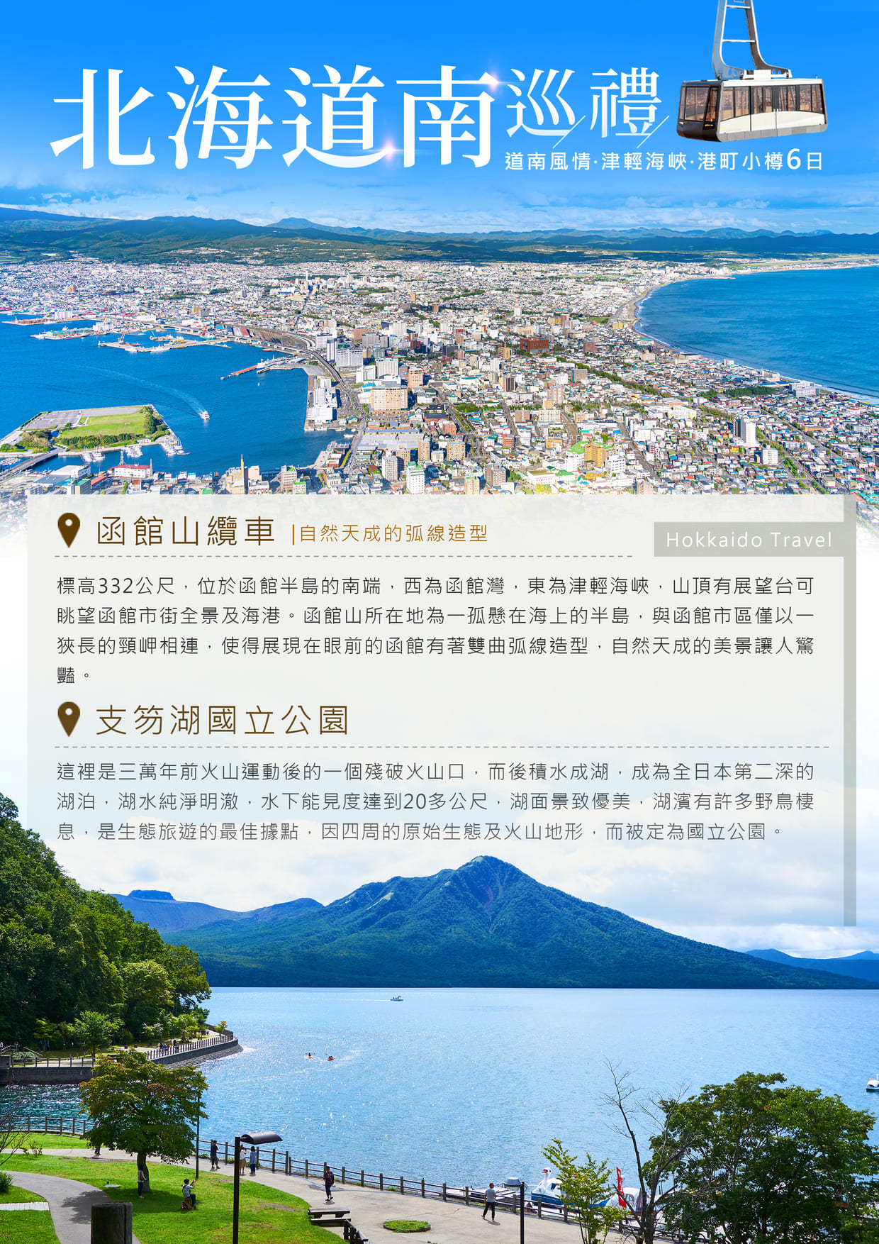 為北海道三大景觀之一,位於支笏洞爺國立公園內。是周長43公里的火山口湖。周邊有被稱為蝦夷富士的羊蹄山、昭和新山、有珠山、洞爺湖溫泉等,是北海道首屈一指的旅遊景點。漂浮在湖中央的中島上生長著野生的北海道鹿。